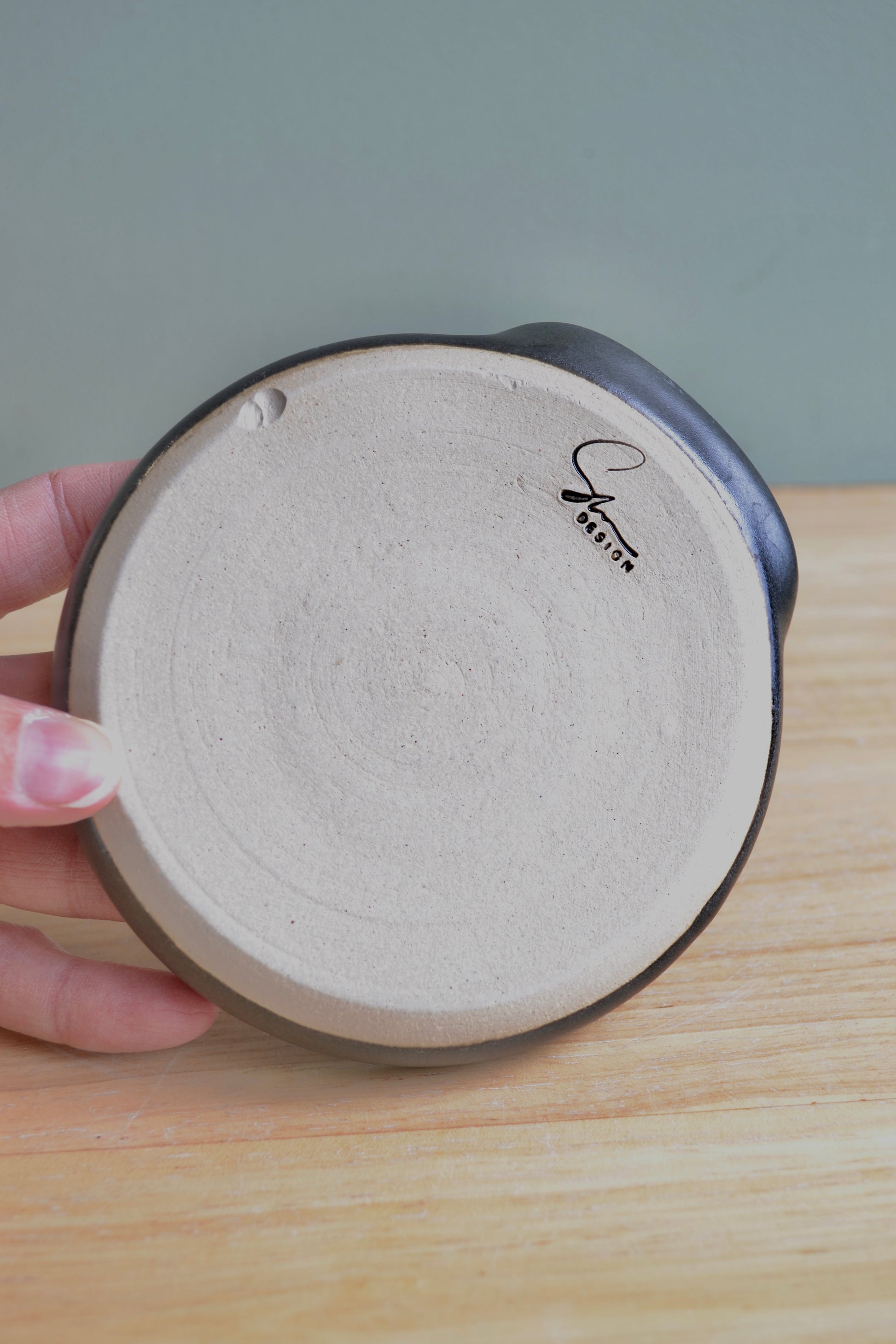 Hand-thrown white stoneware spoon rest with my own grey glaze.