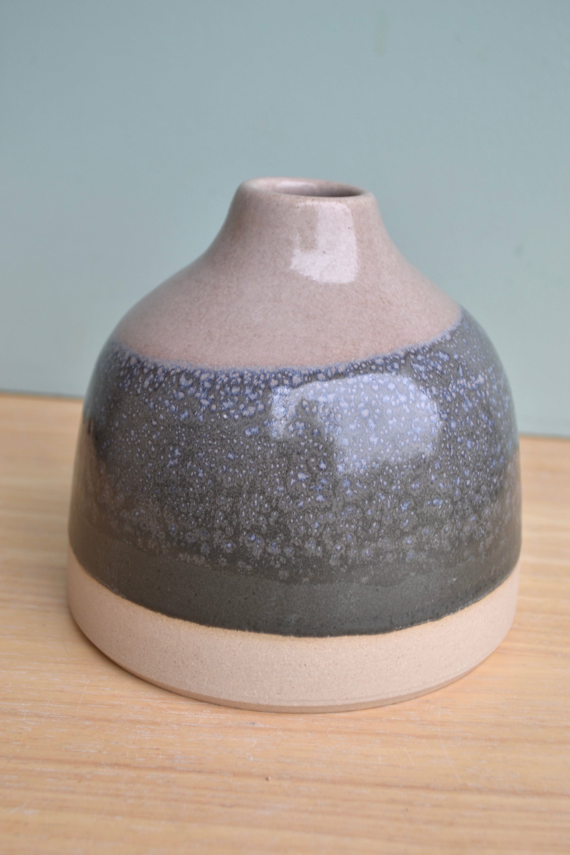 Hand-thrown white stoneware diffuser vase with my own pink and grey glaze.