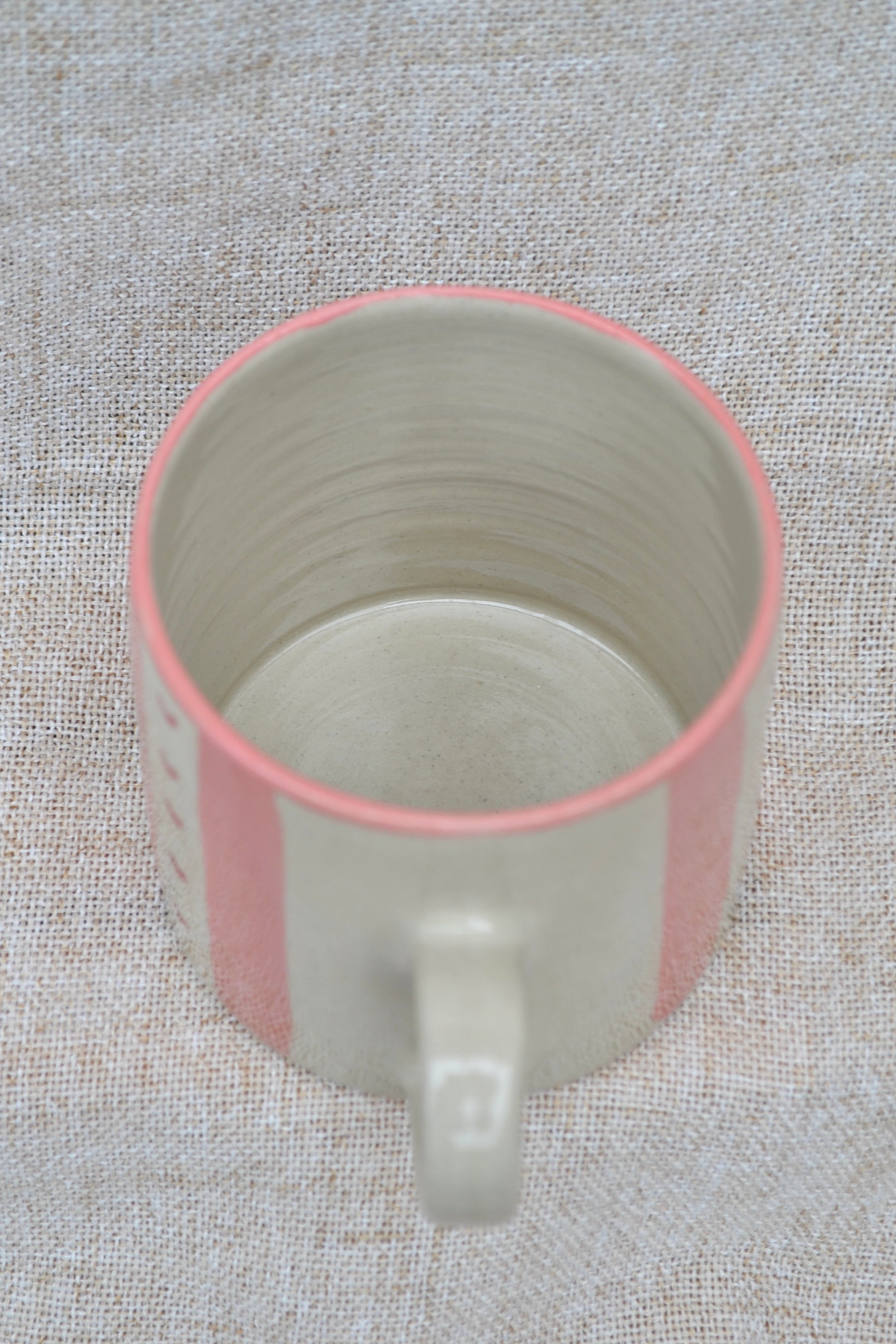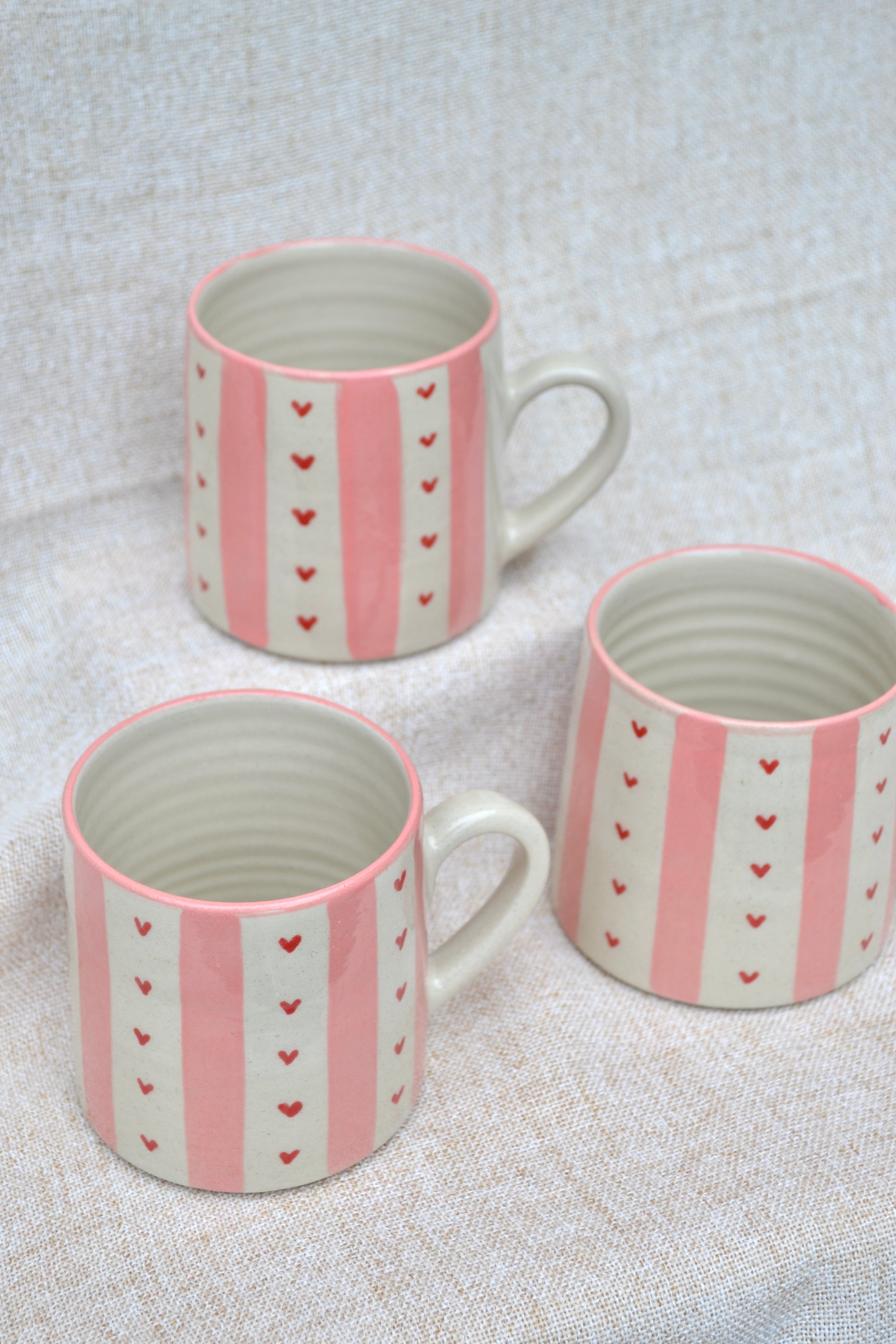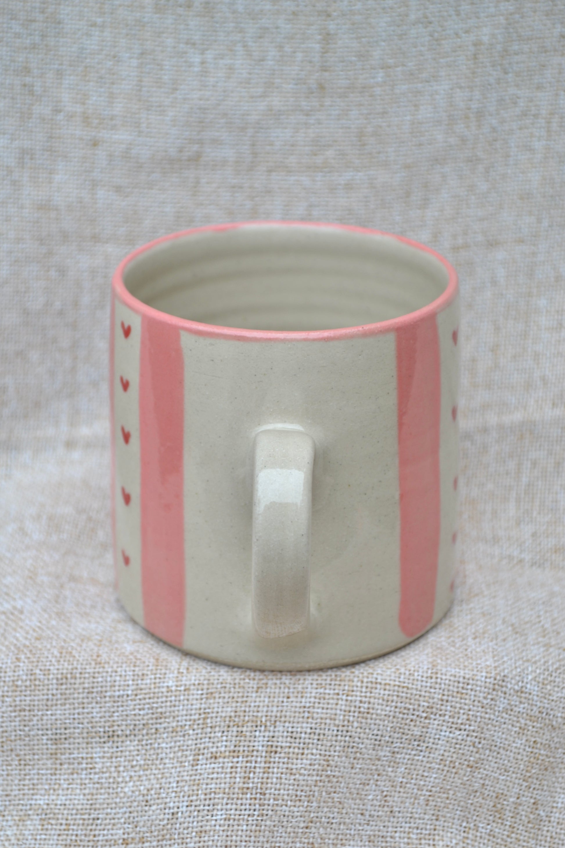 Hand-thrown stoneware mug with hand painted stripe designs. Thrown to fit naturally in the hands, each mug is glazed in gentle Valentine’s hues that make morning coffee or evening tea feel a little more special.