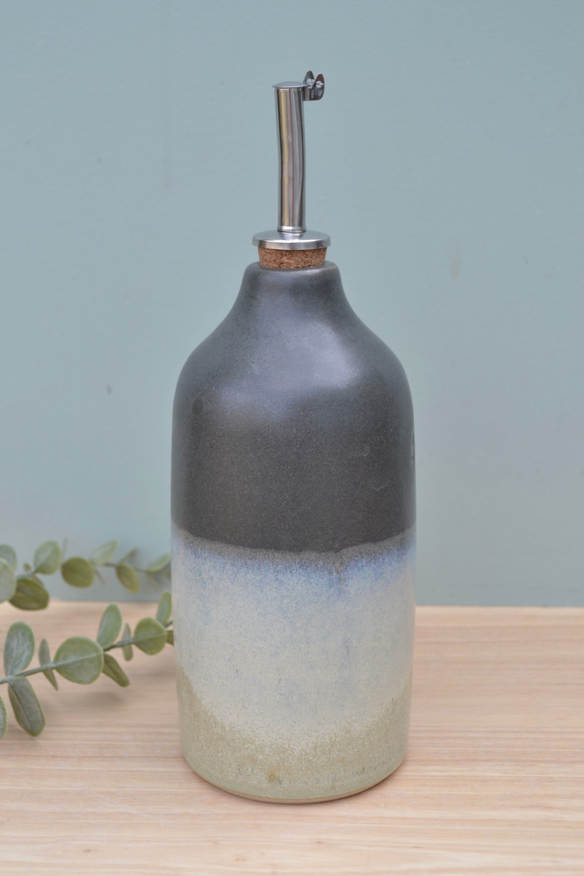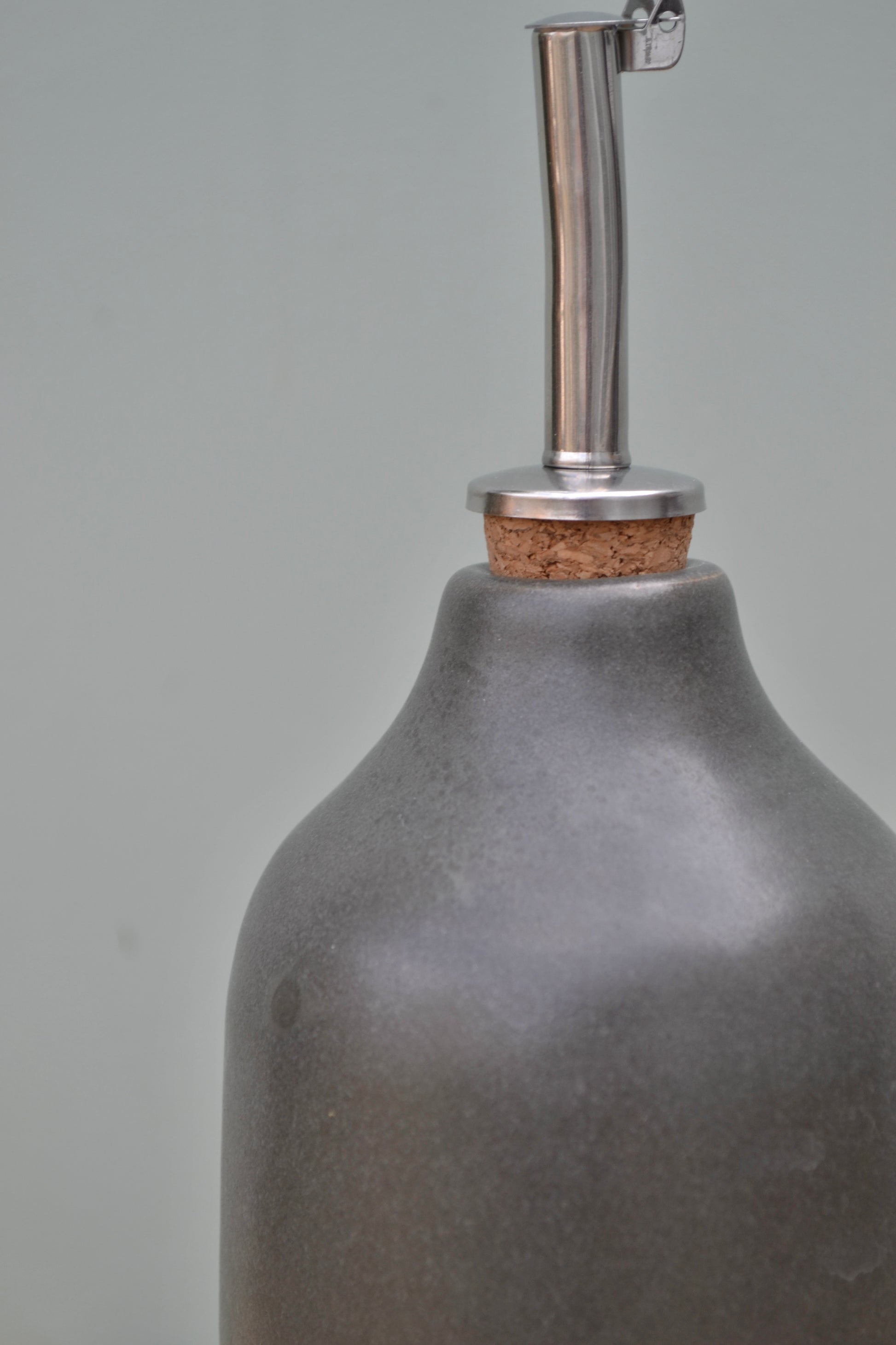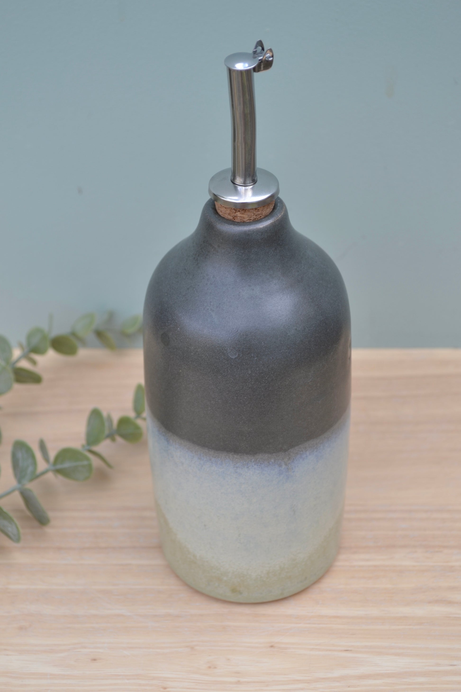 This hand-thrown stoneware oil bottle comes with a cork and a metal pourer, allowing you to refill your oil whenever needed.