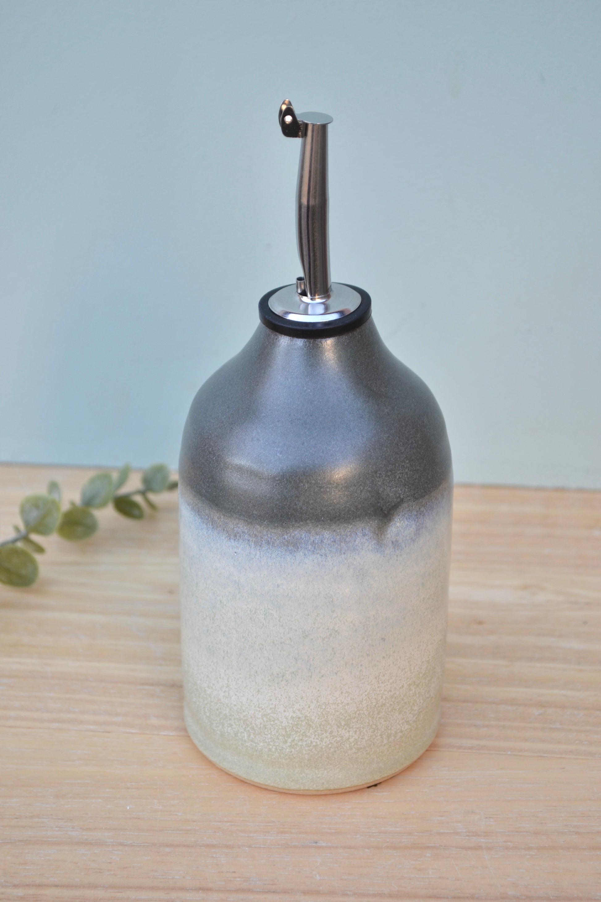 This hand-thrown stoneware oil bottle comes with a cork or rubber pourer, allowing you to refill your oil whenever needed.