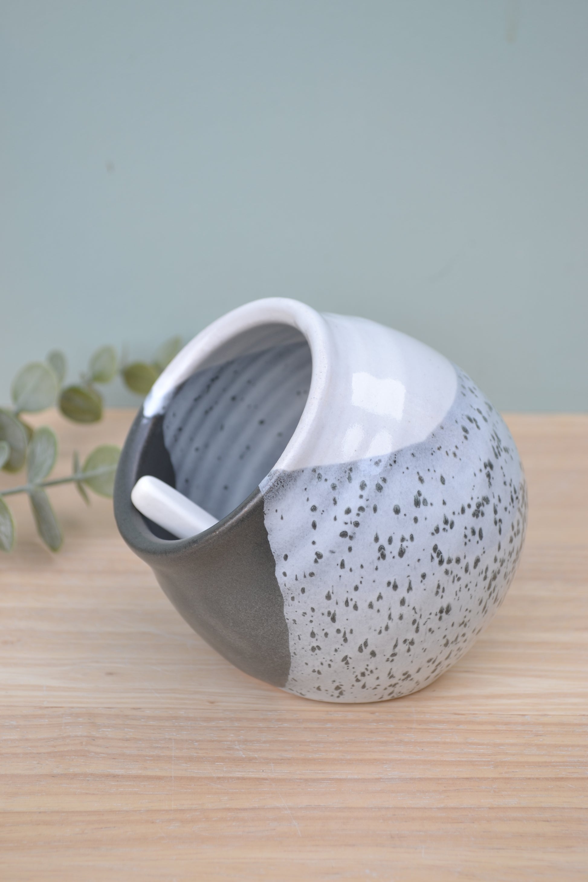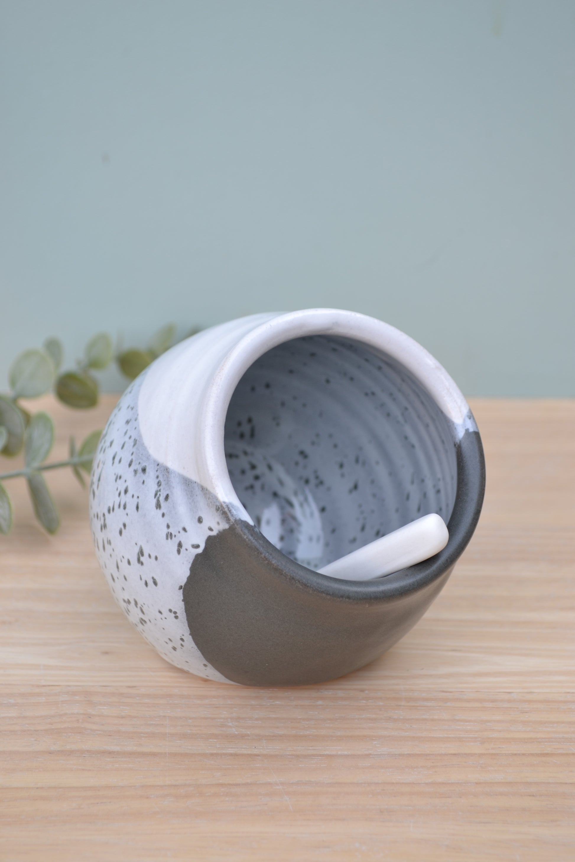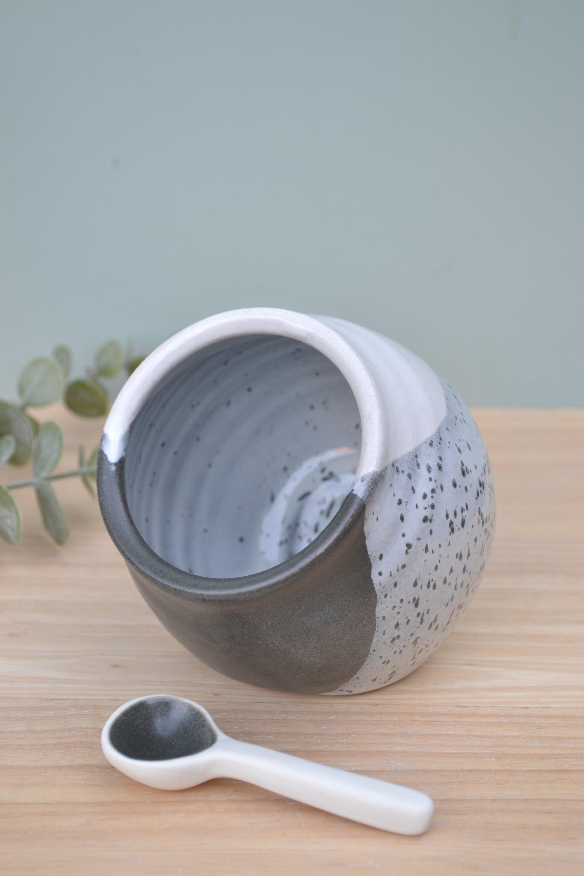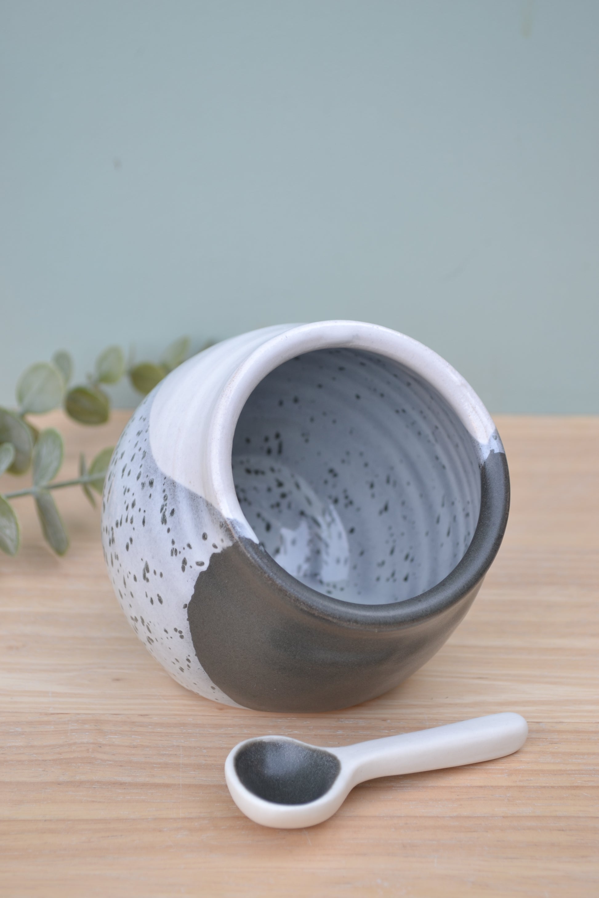 Hand-thrown white stoneware salt pig and slip-cast porcelain spoon.
