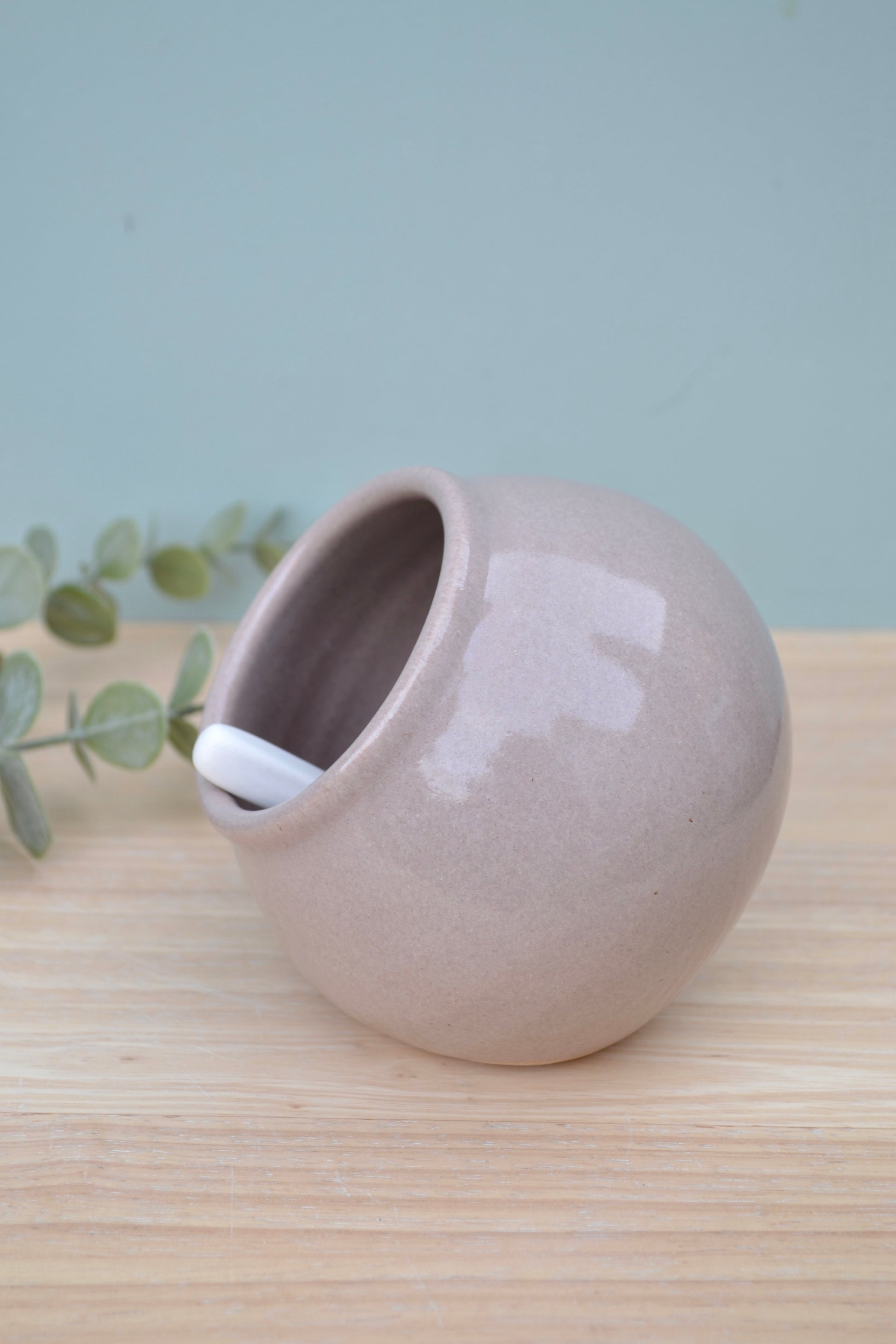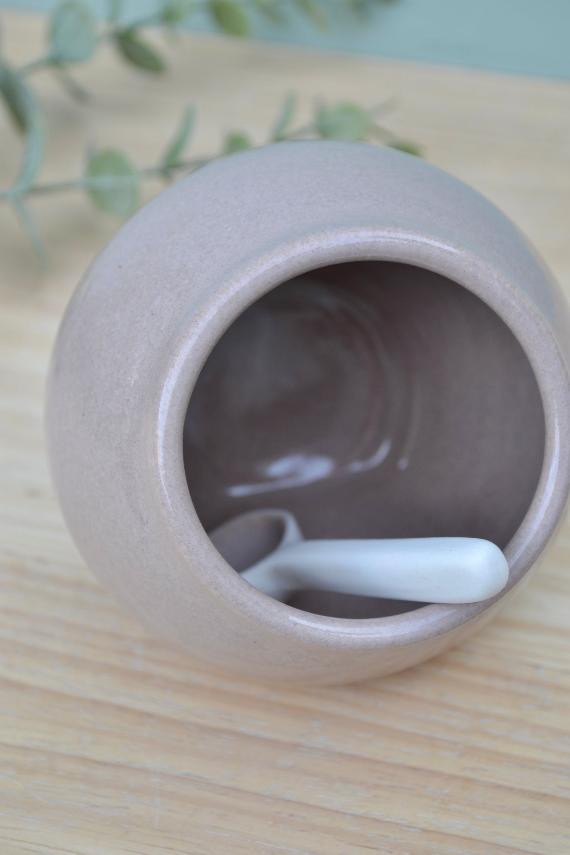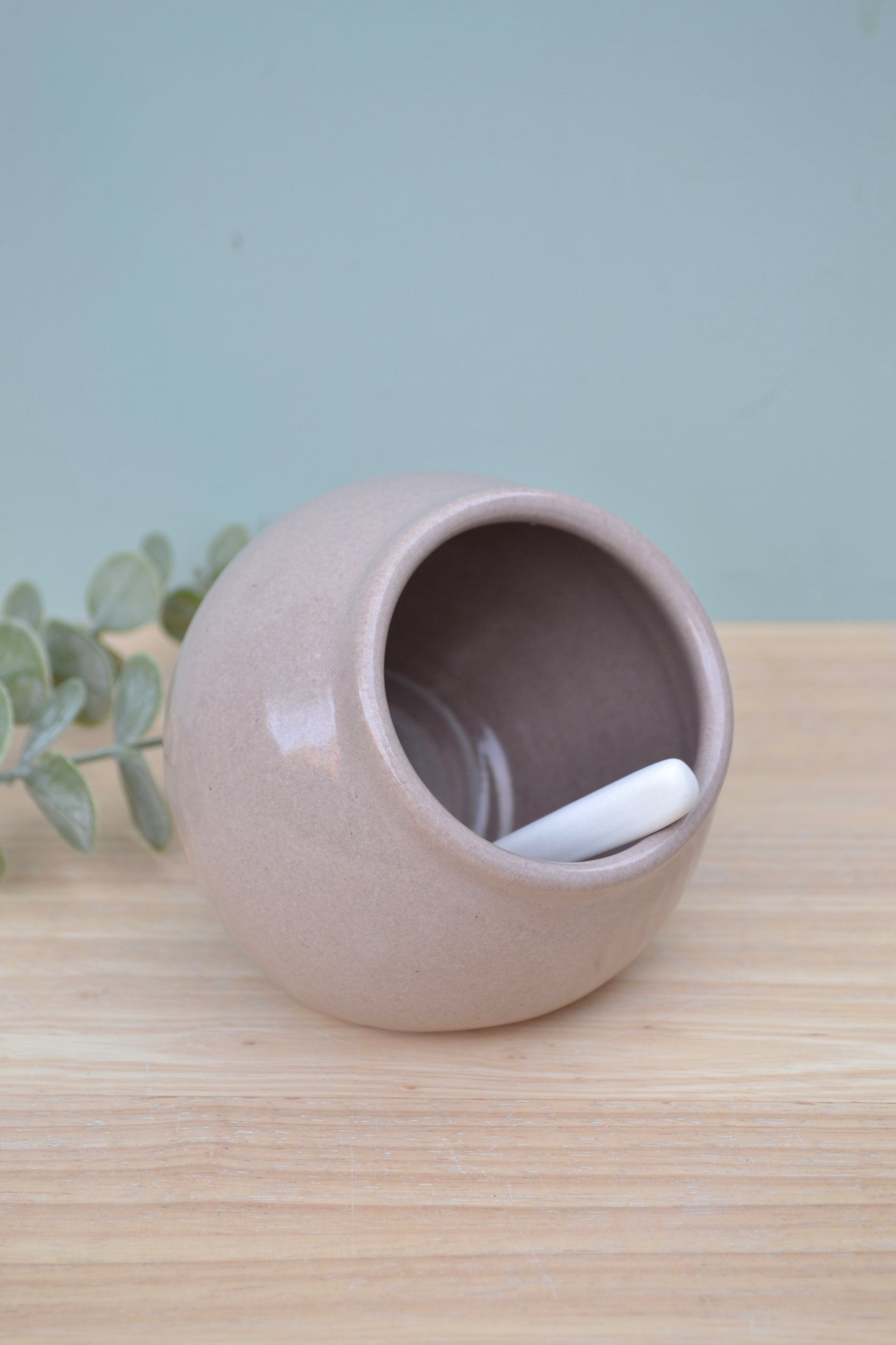 Hand-thrown white stoneware salt pig and slip-cast porcelain spoon.