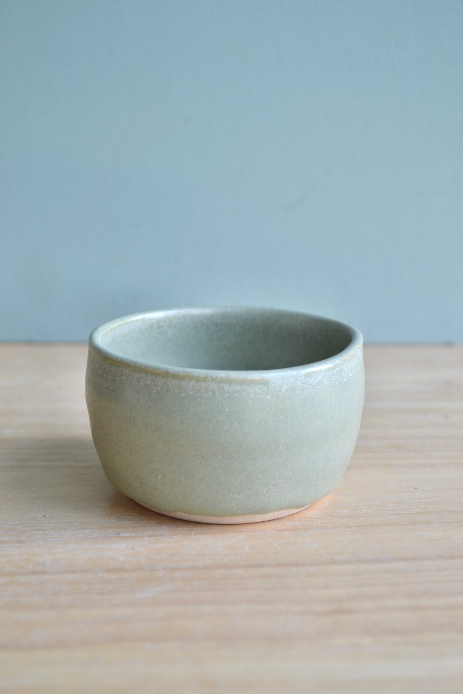 Small hand-thrown white stoneware dipping bowl with my own green glaze.