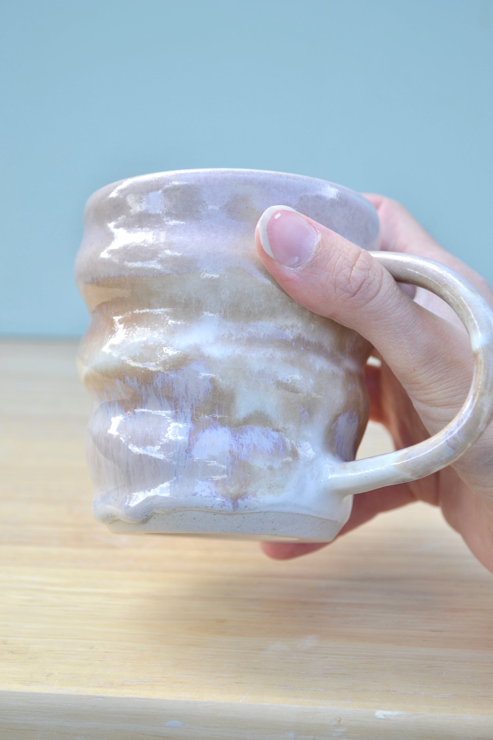 Hand-thrown white stoneware small spiral mug with my own pink and white glaze.