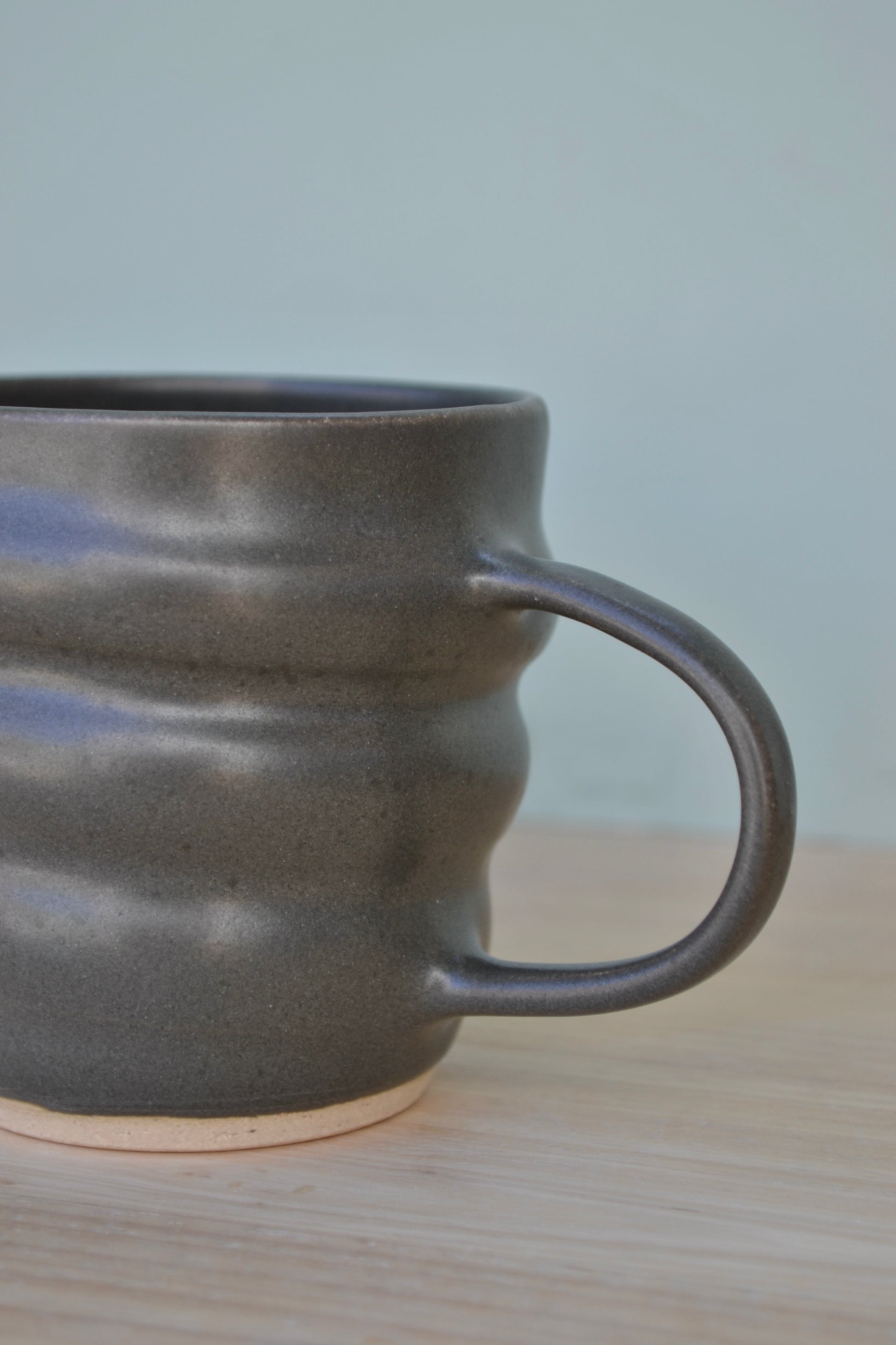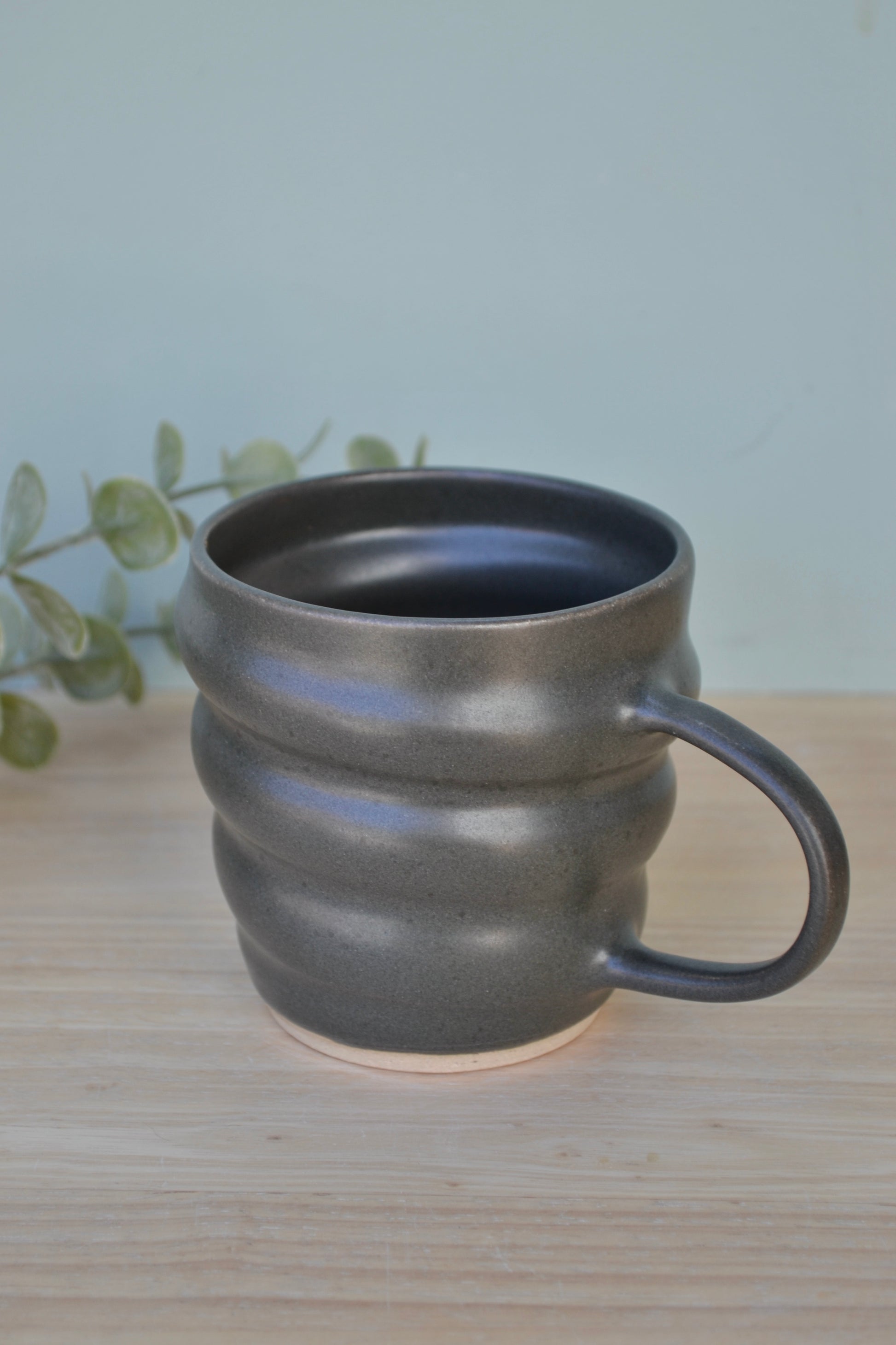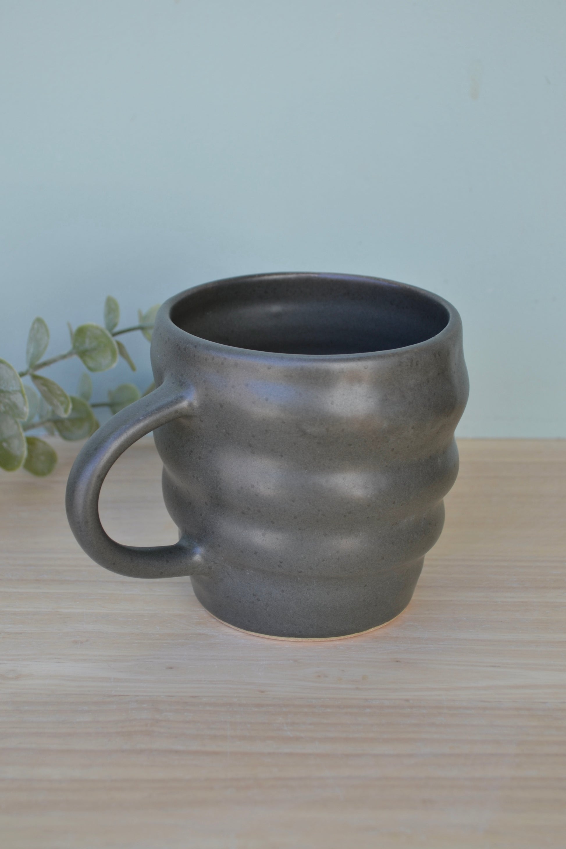 Hand-thrown stoneware mug with added thrown spiral. The spiral allows the mug to sit comfortably in the hand.