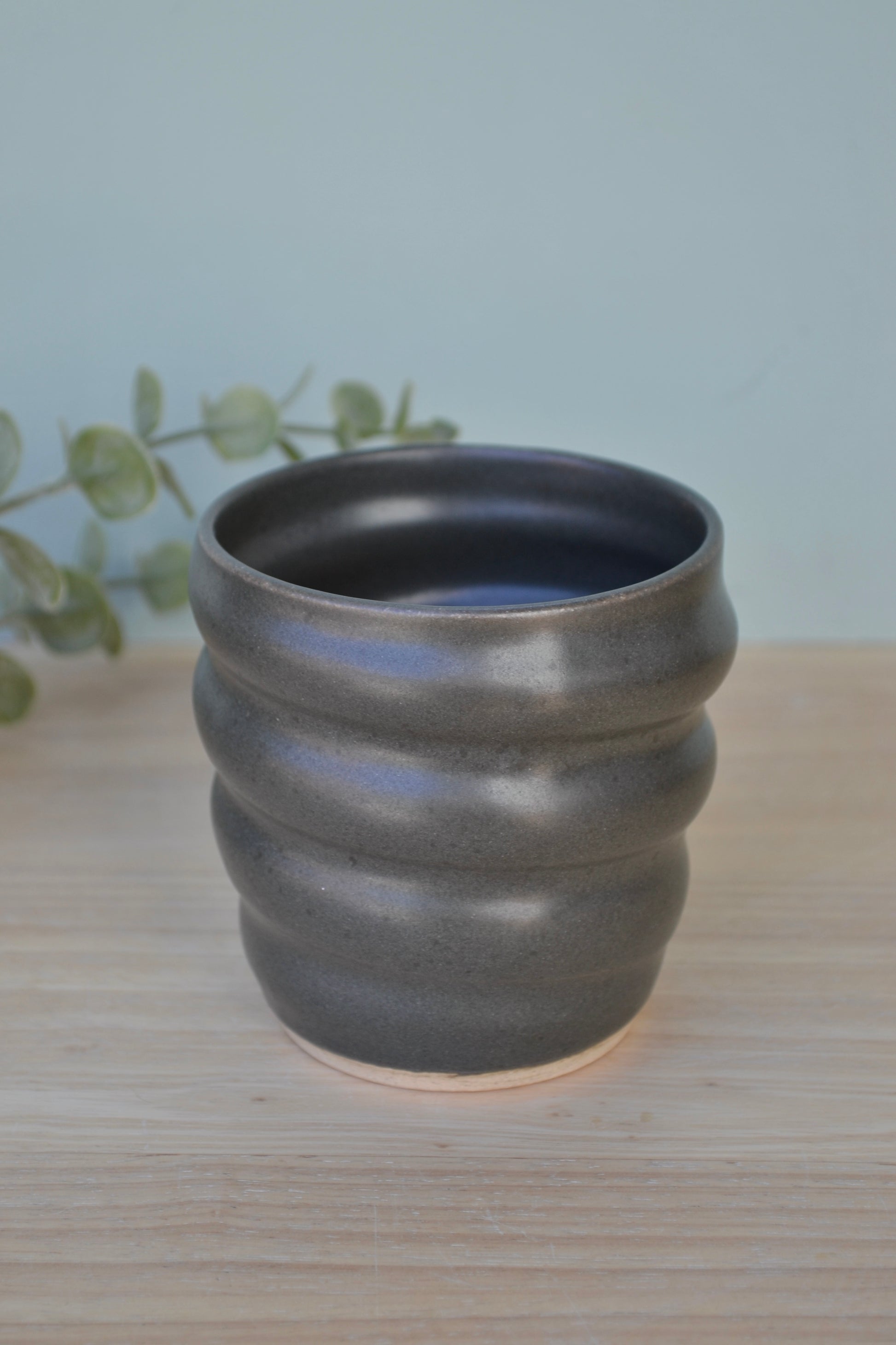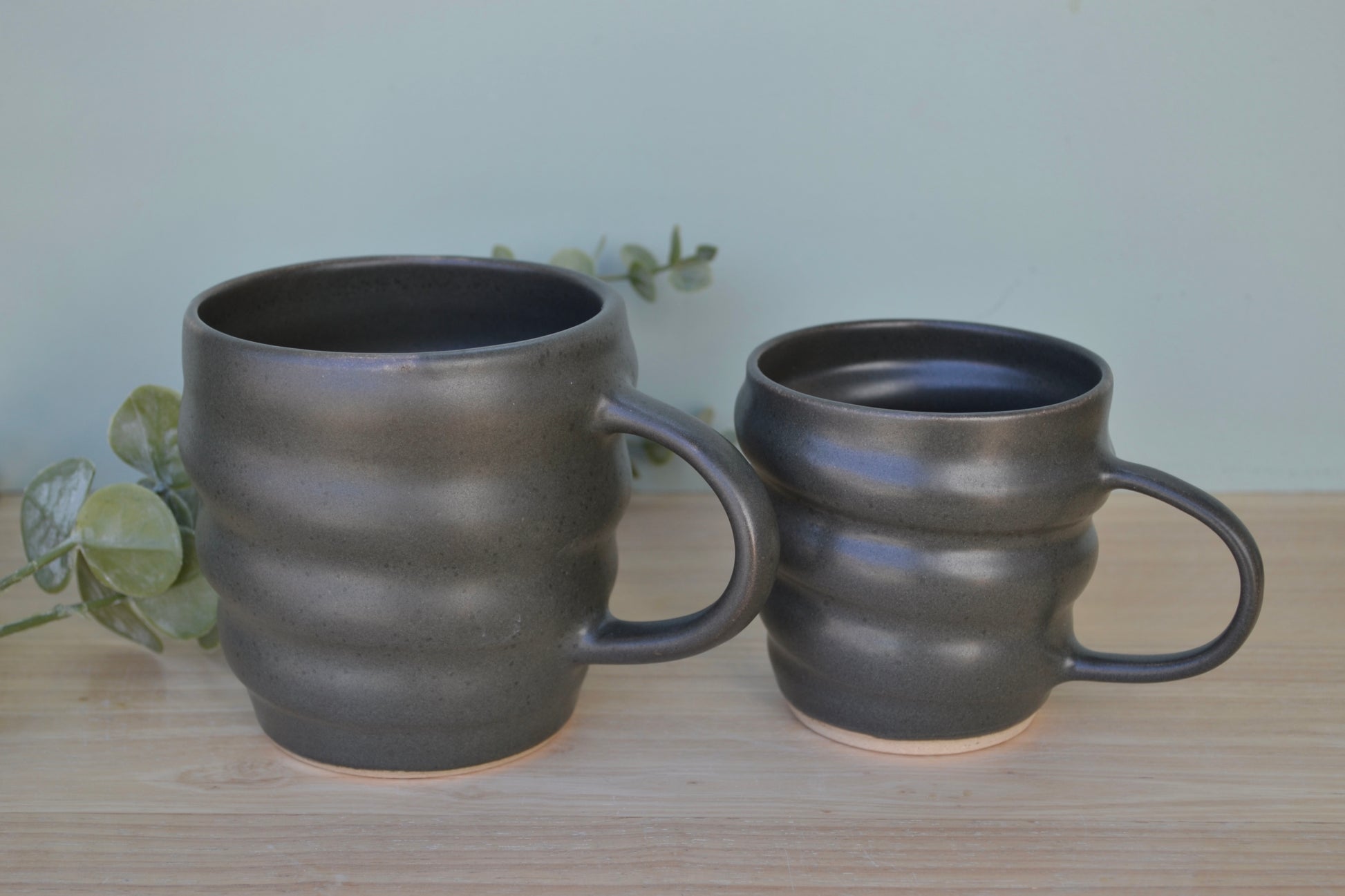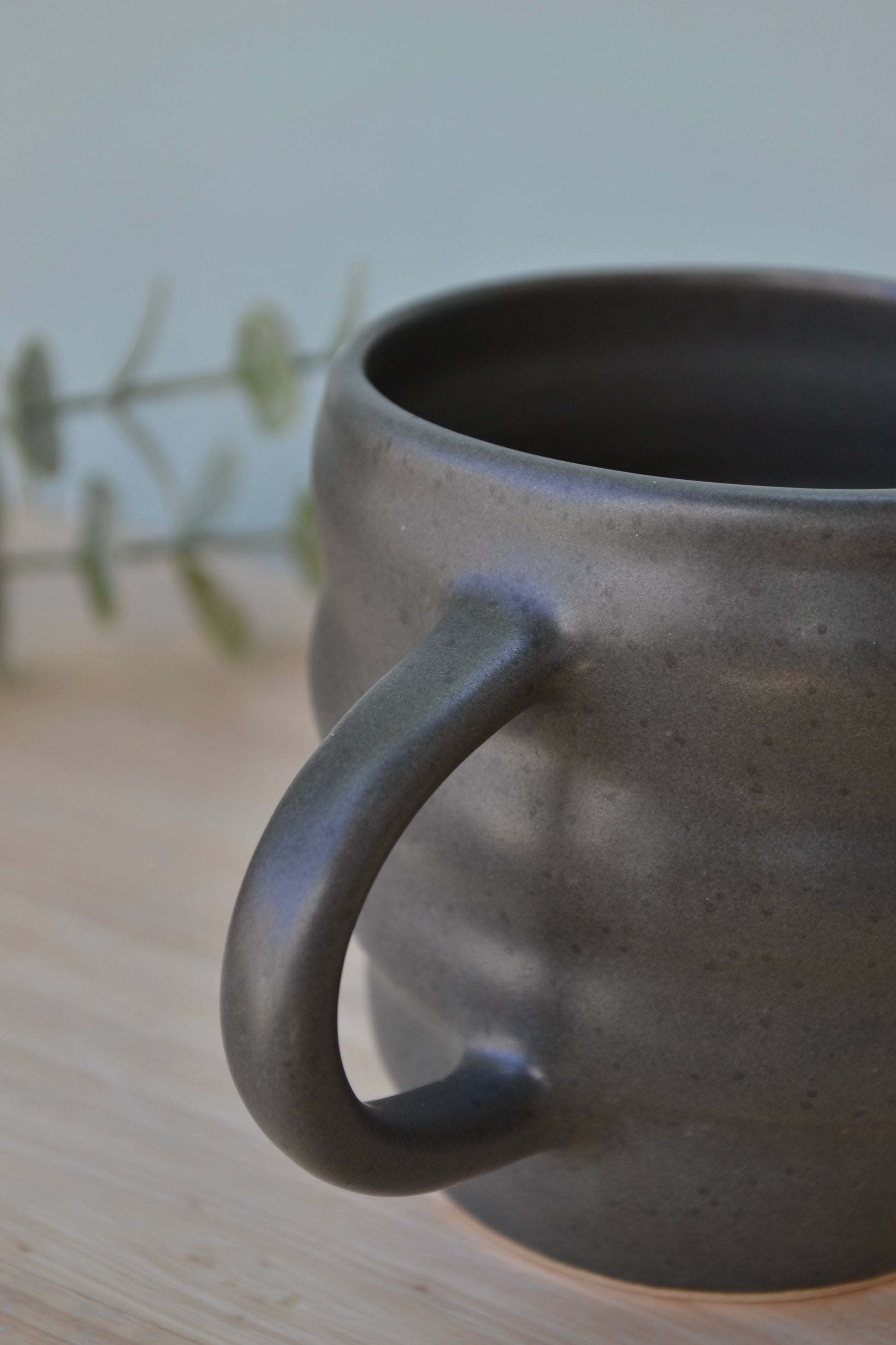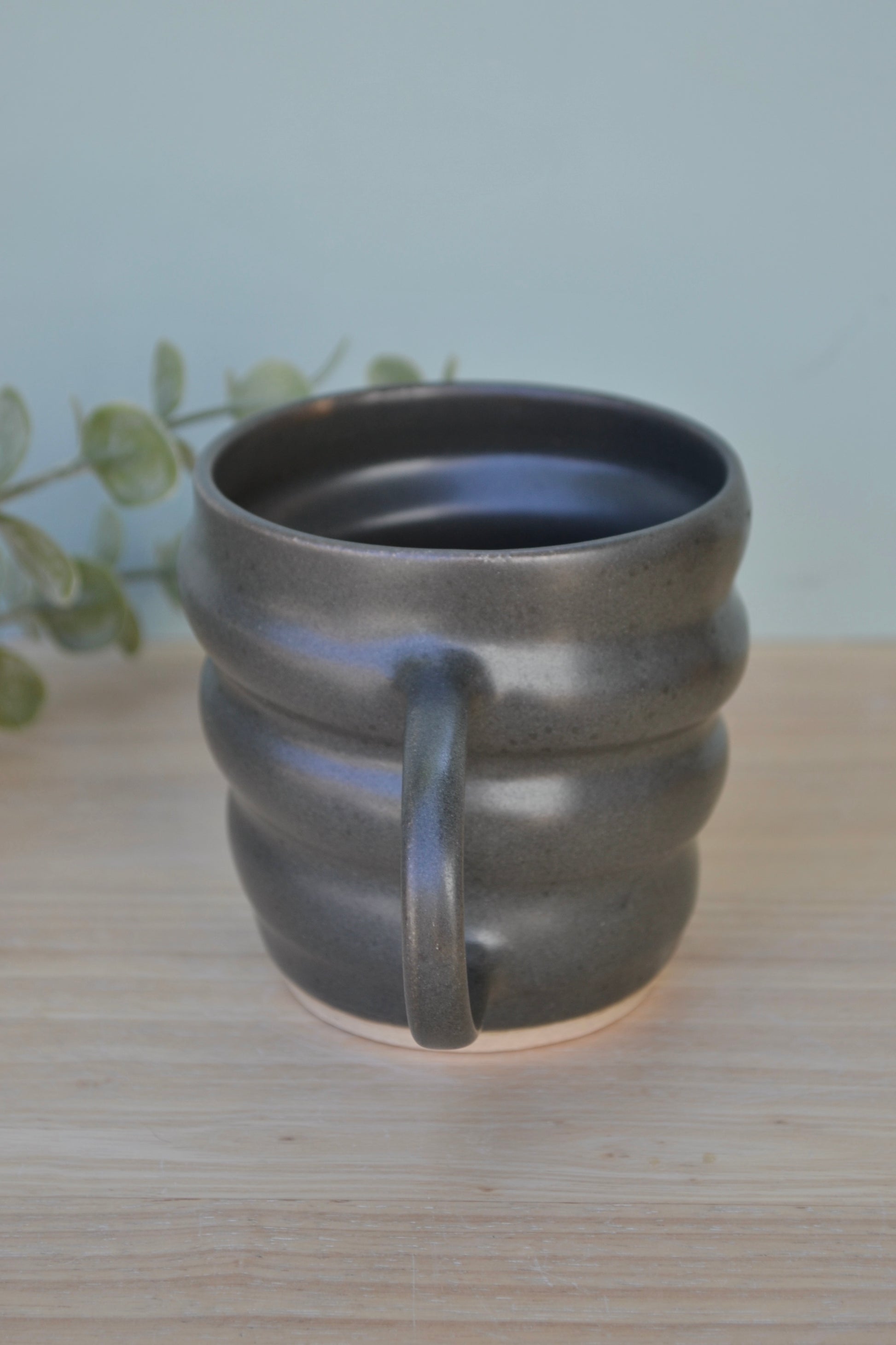 Hand-thrown stoneware mug with added thrown spiral. The spiral allows the mug to sit comfortably in the hand.