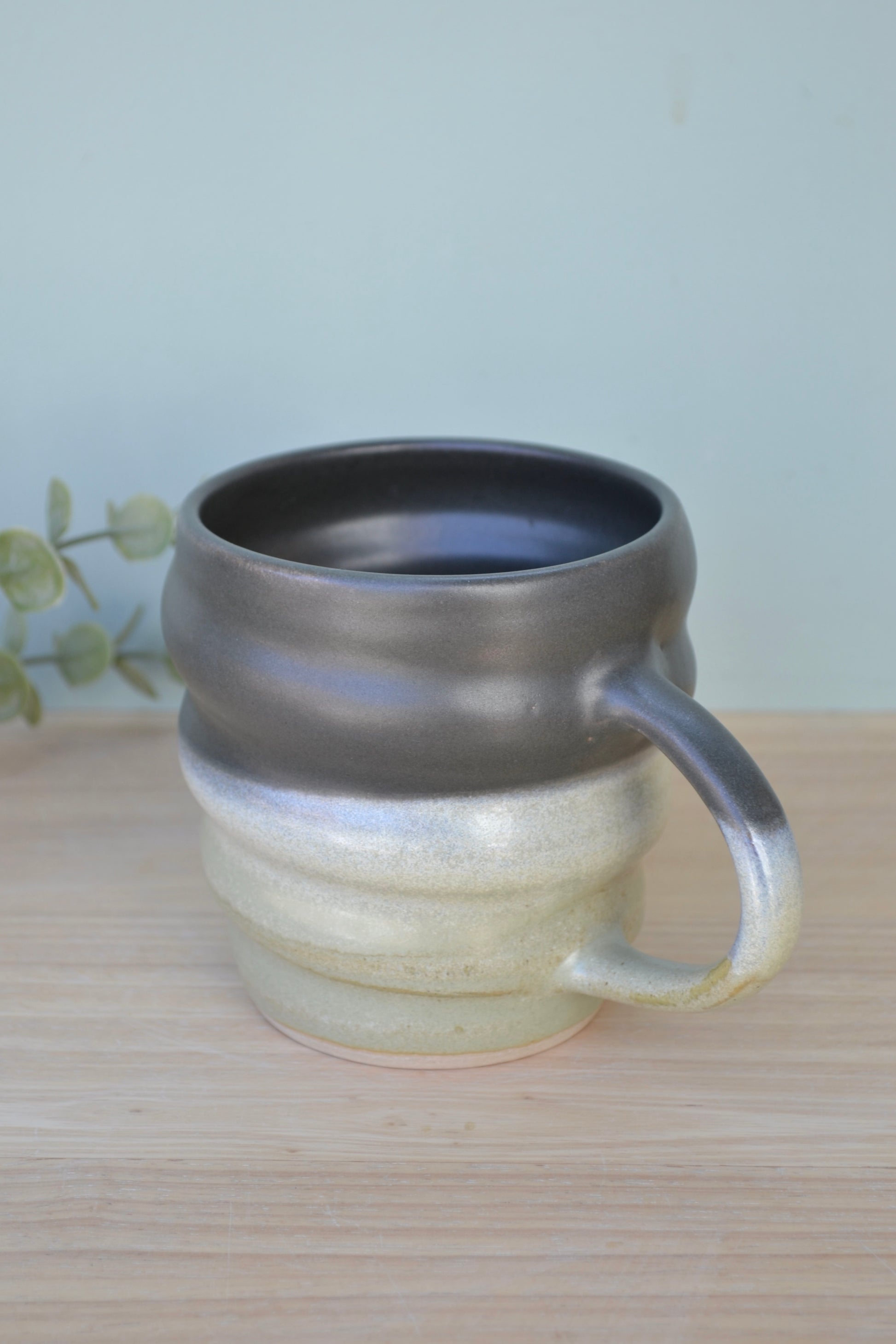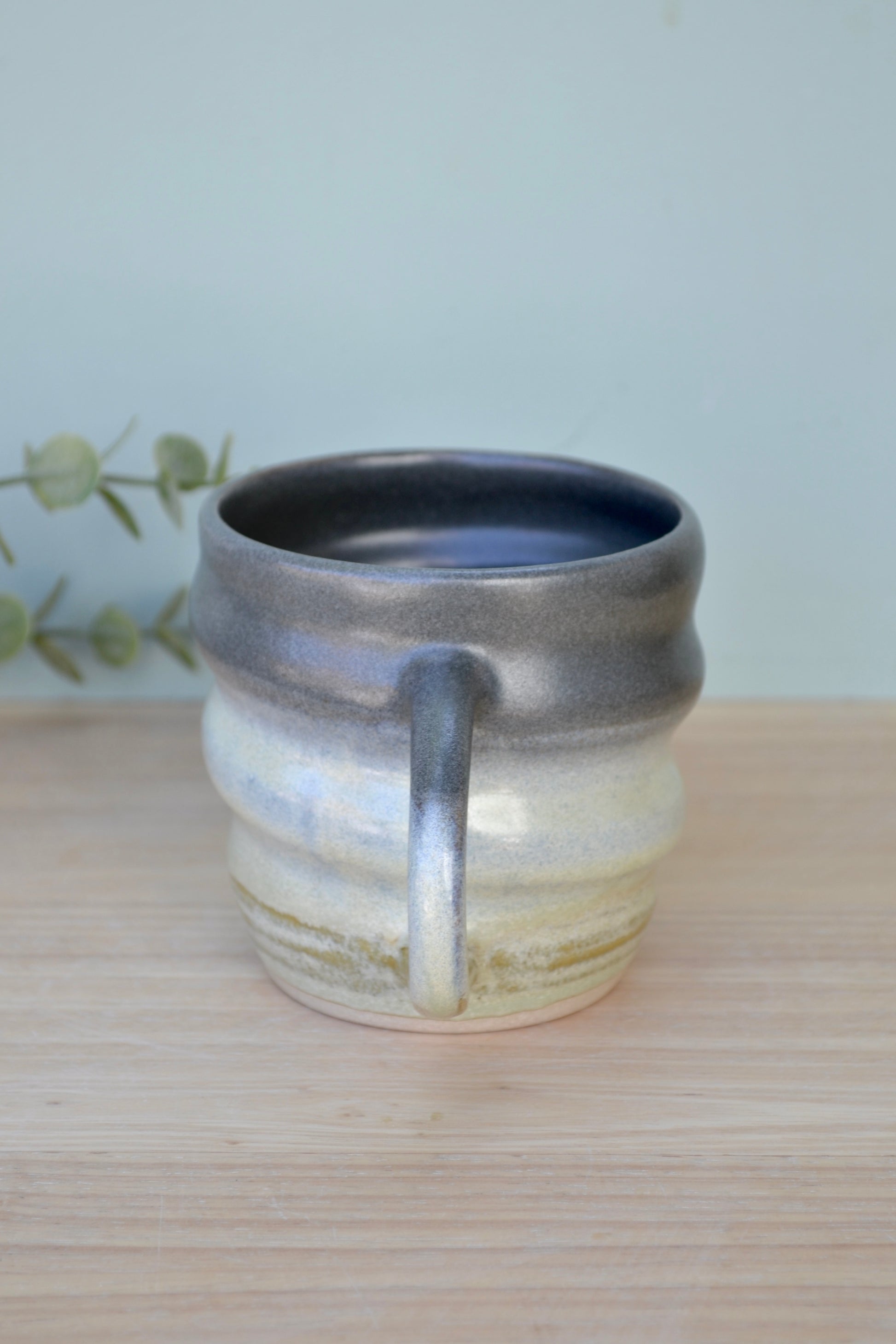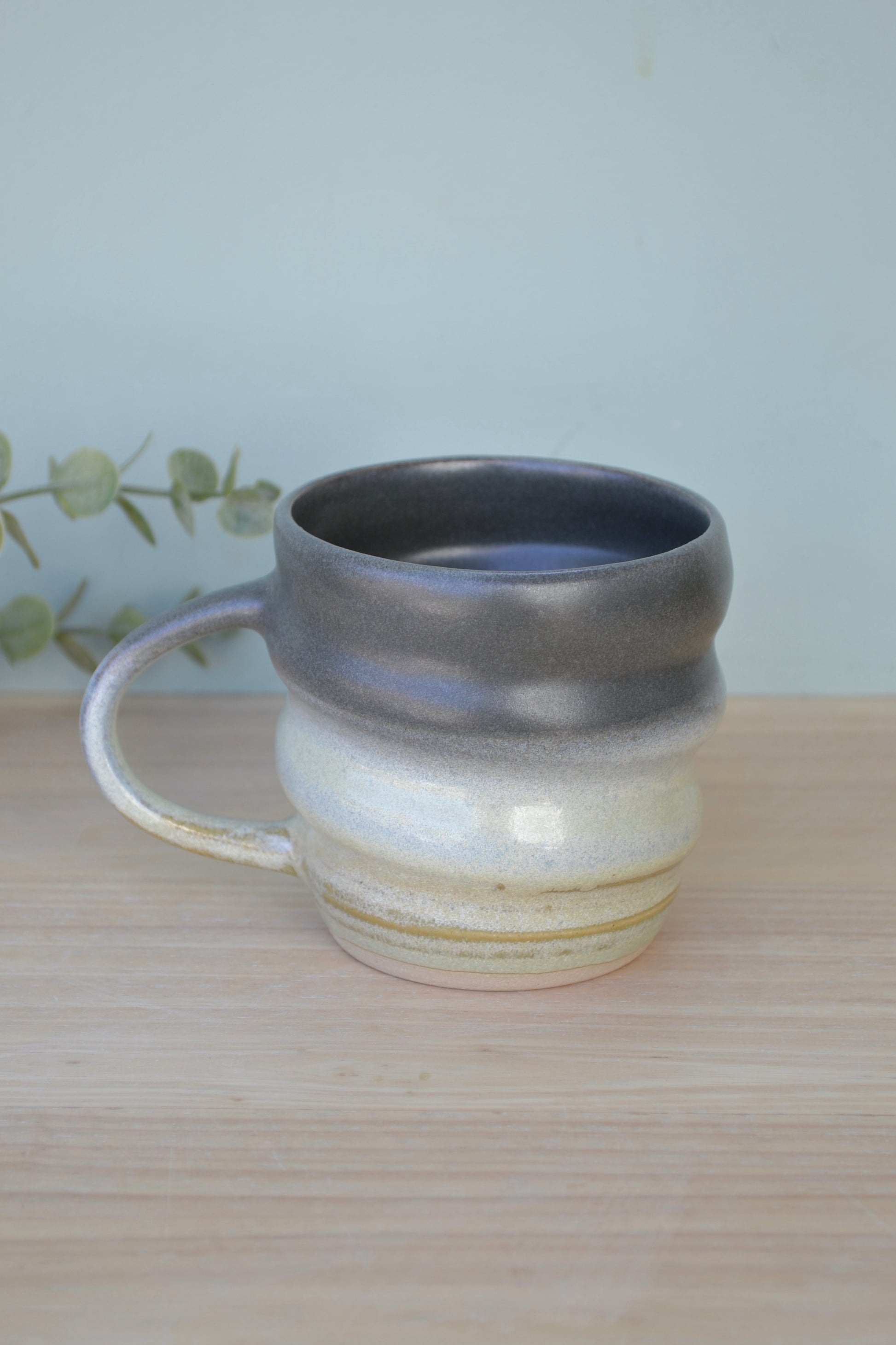Hand-thrown stoneware mug with added thrown spiral. The spiral allows the mug to sit comfortably in the hand.