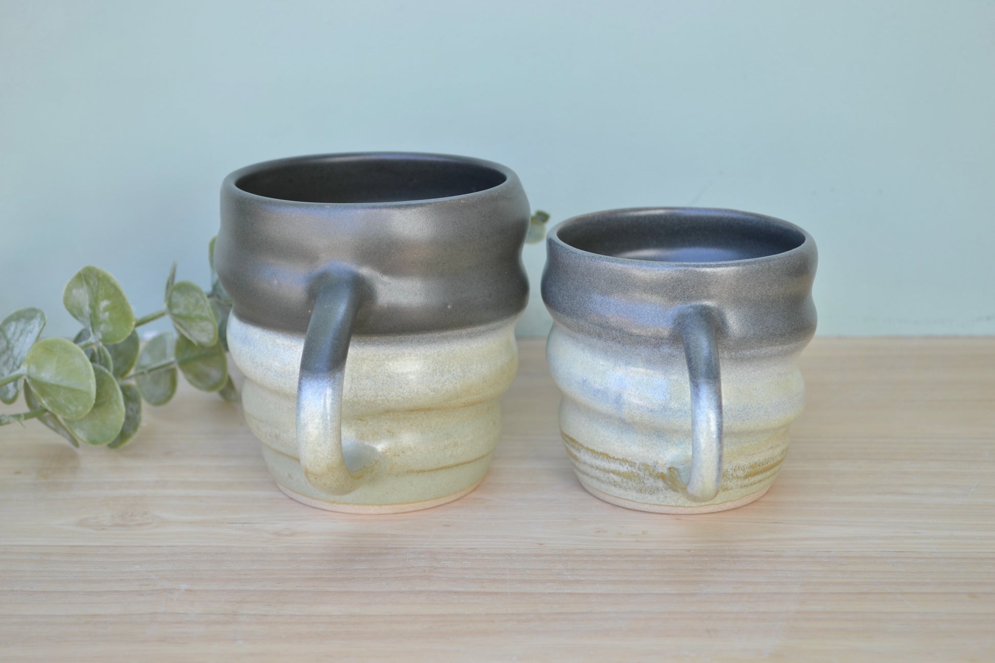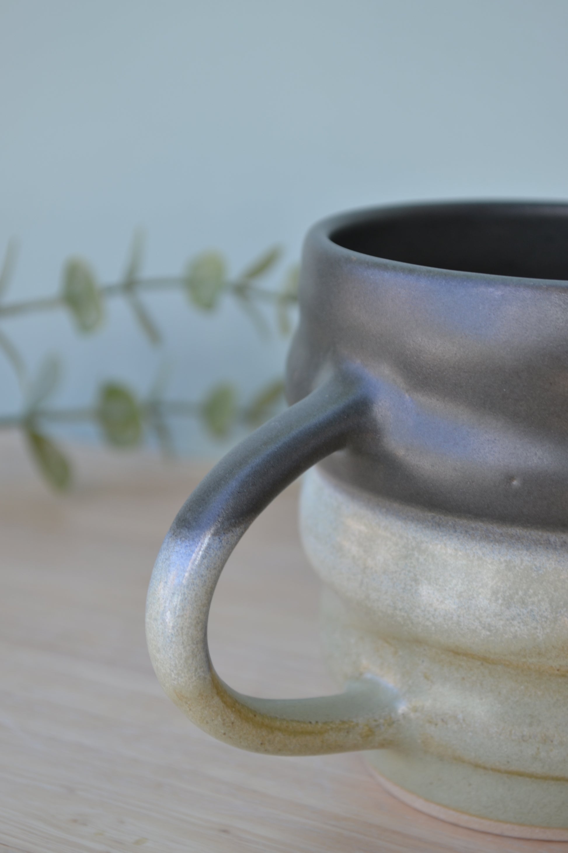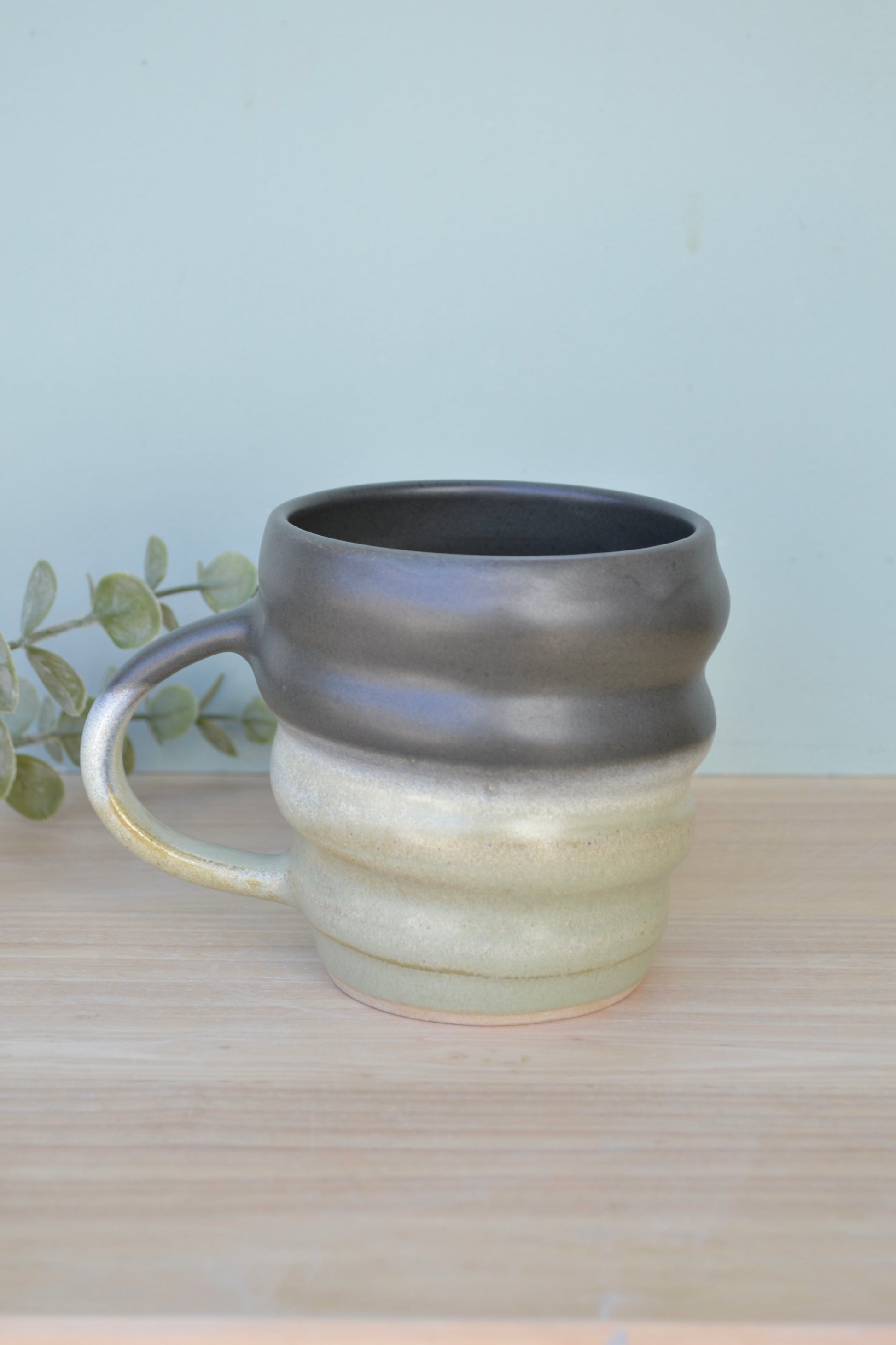 Hand-thrown stoneware mug with added thrown spiral. The spiral allows the mug to sit comfortably in the hand.