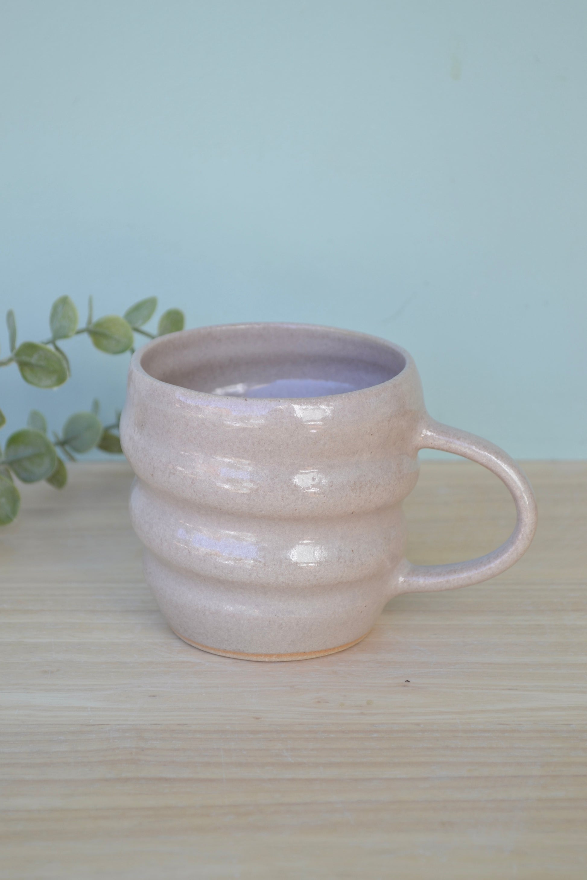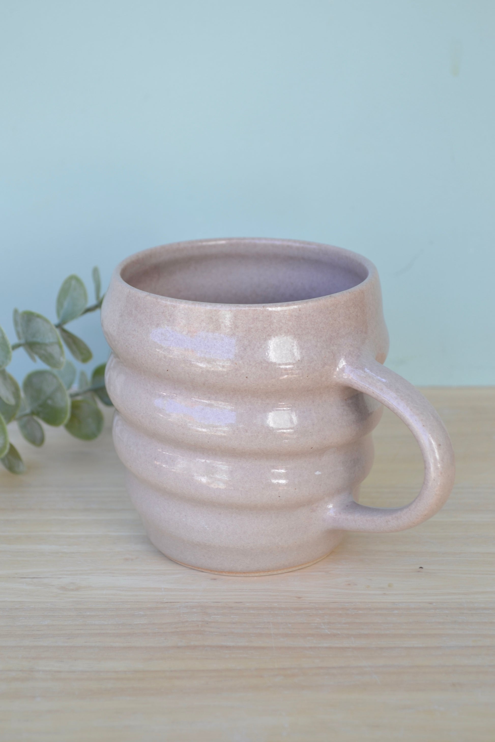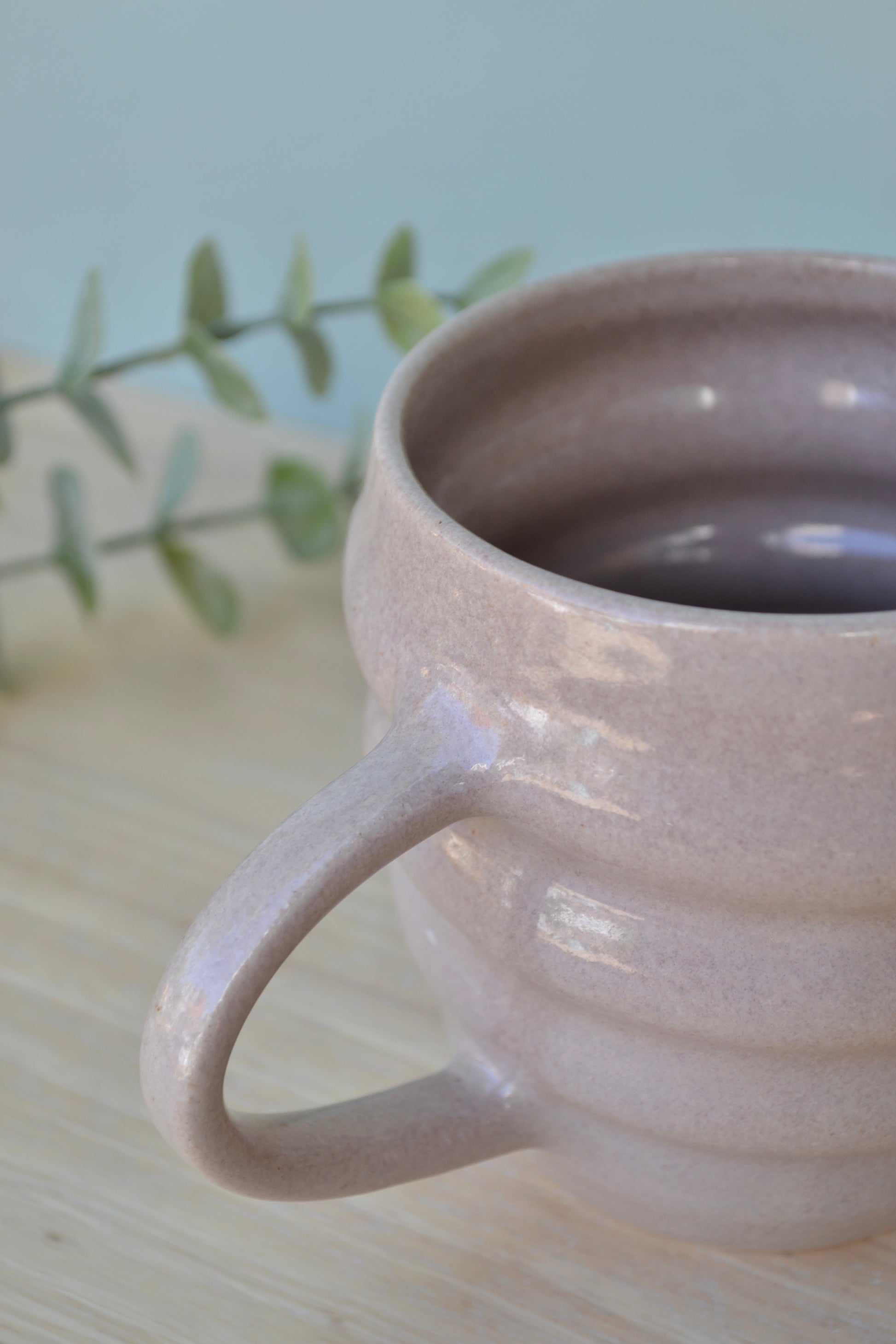Hand-thrown stoneware mug with added thrown spiral. The spiral allows the mug to sit comfortably in the hand.
