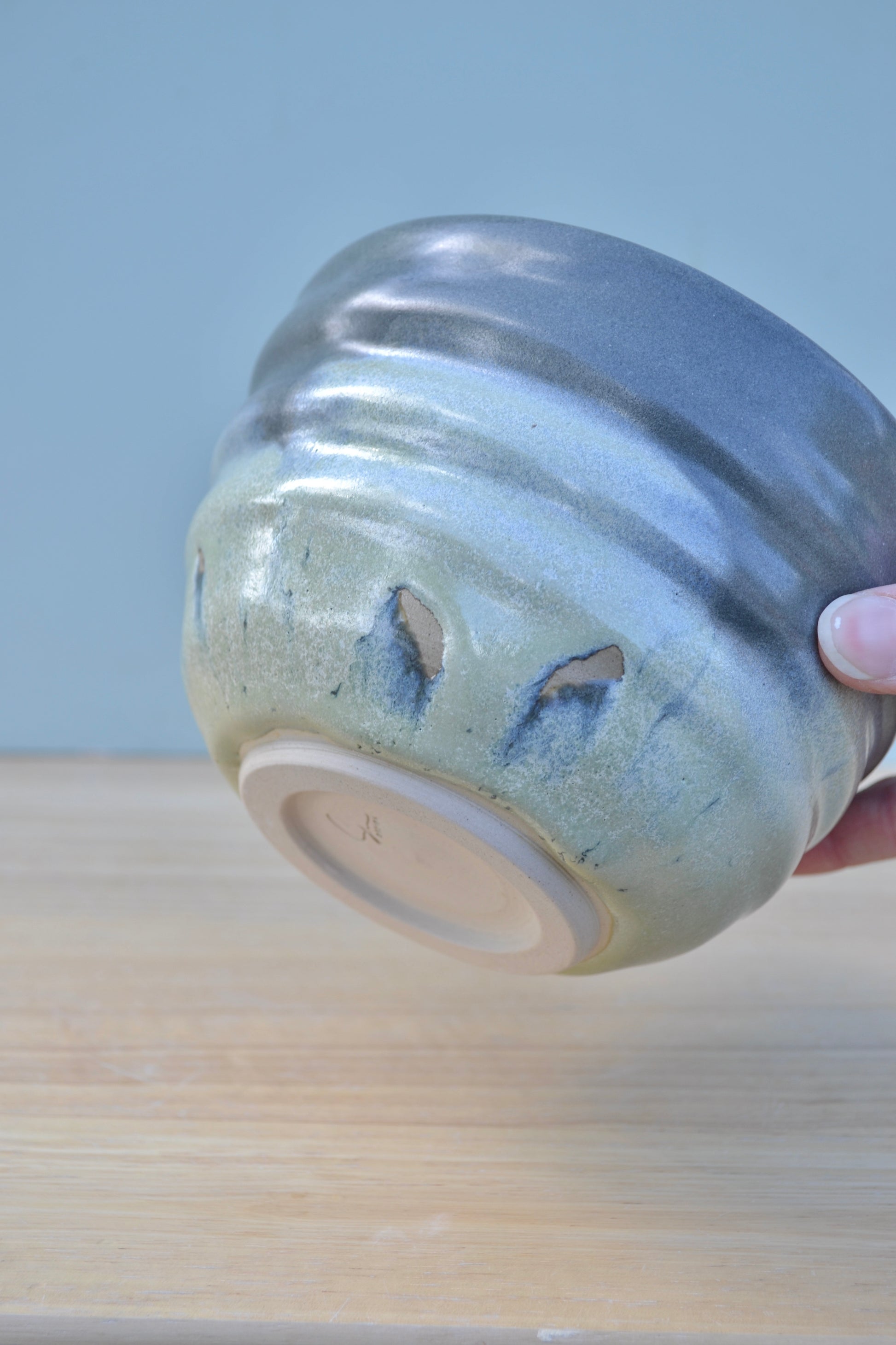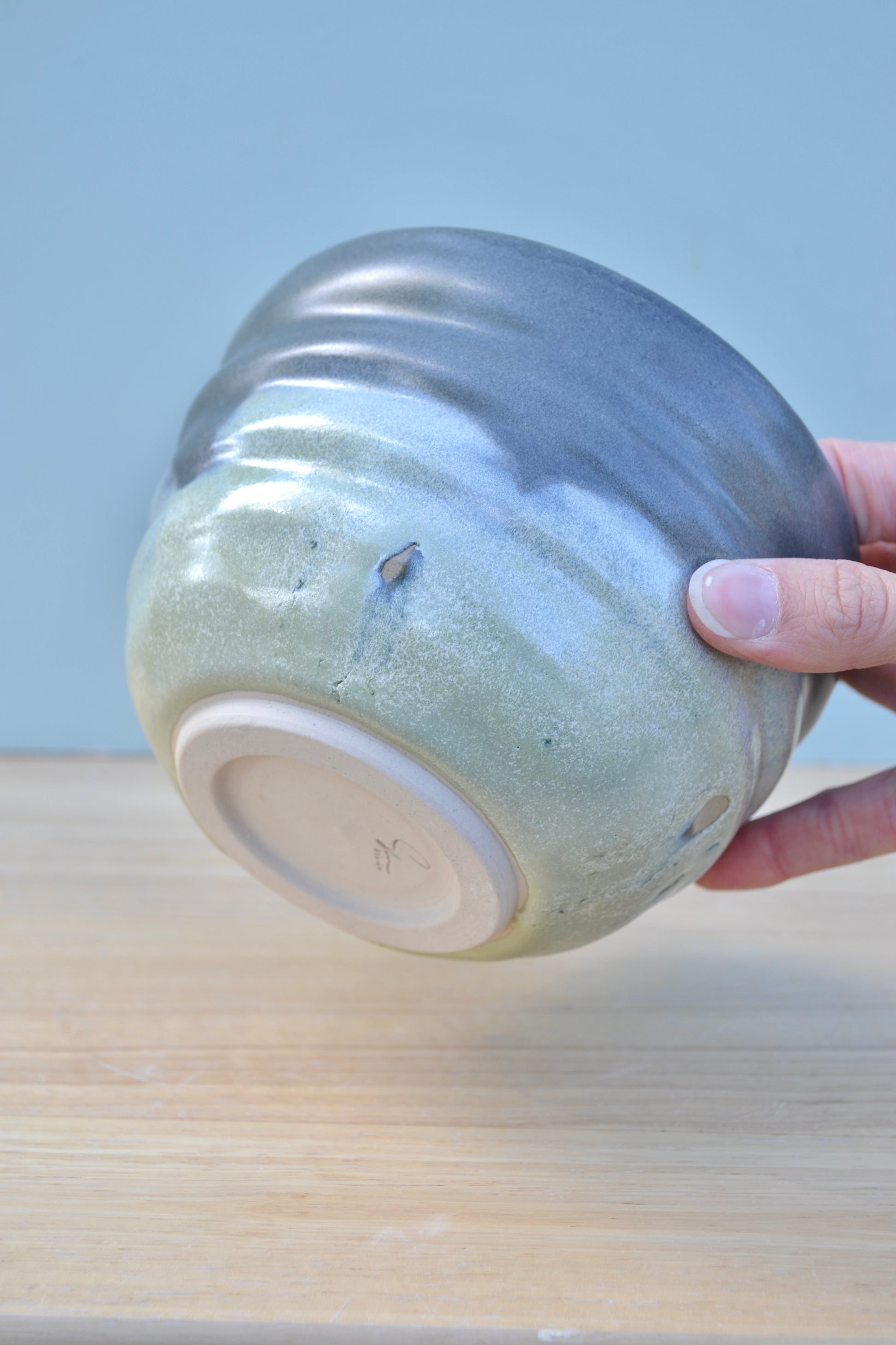 Hand-thrown white stoneware spiral noodle bowl with my own green and grey glaze.