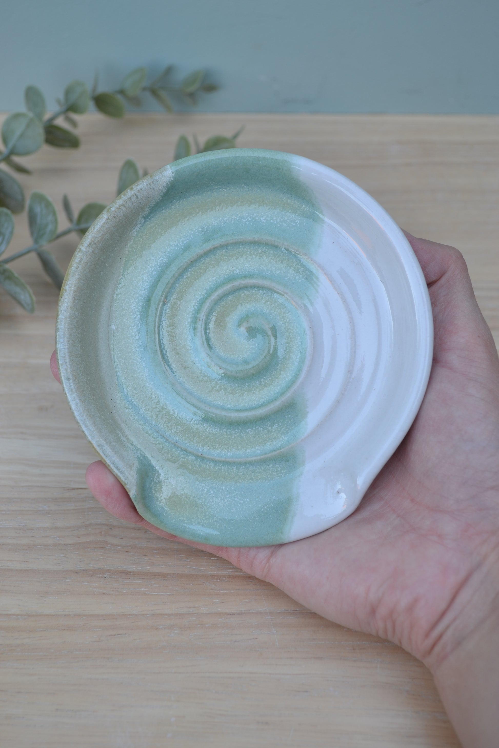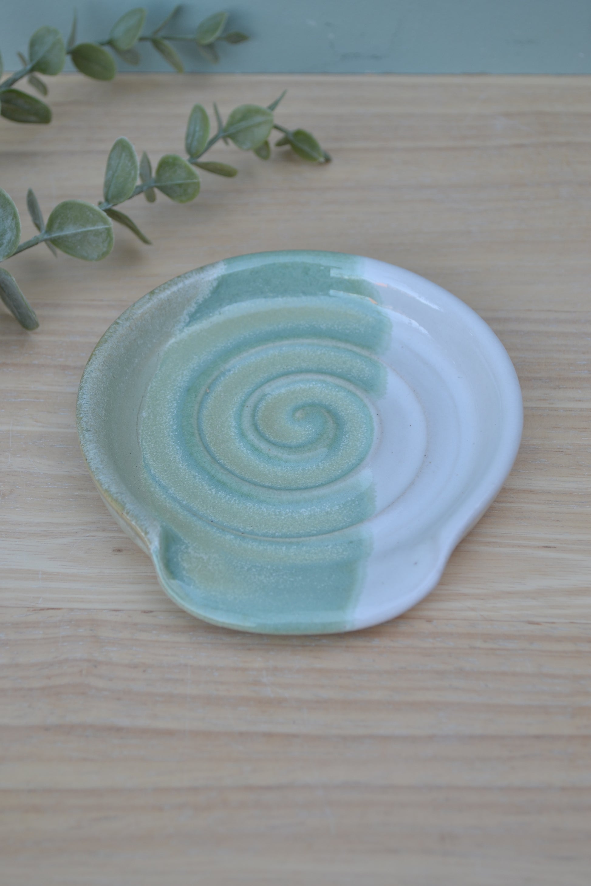 Hand-thrown white stoneware spoon rest.