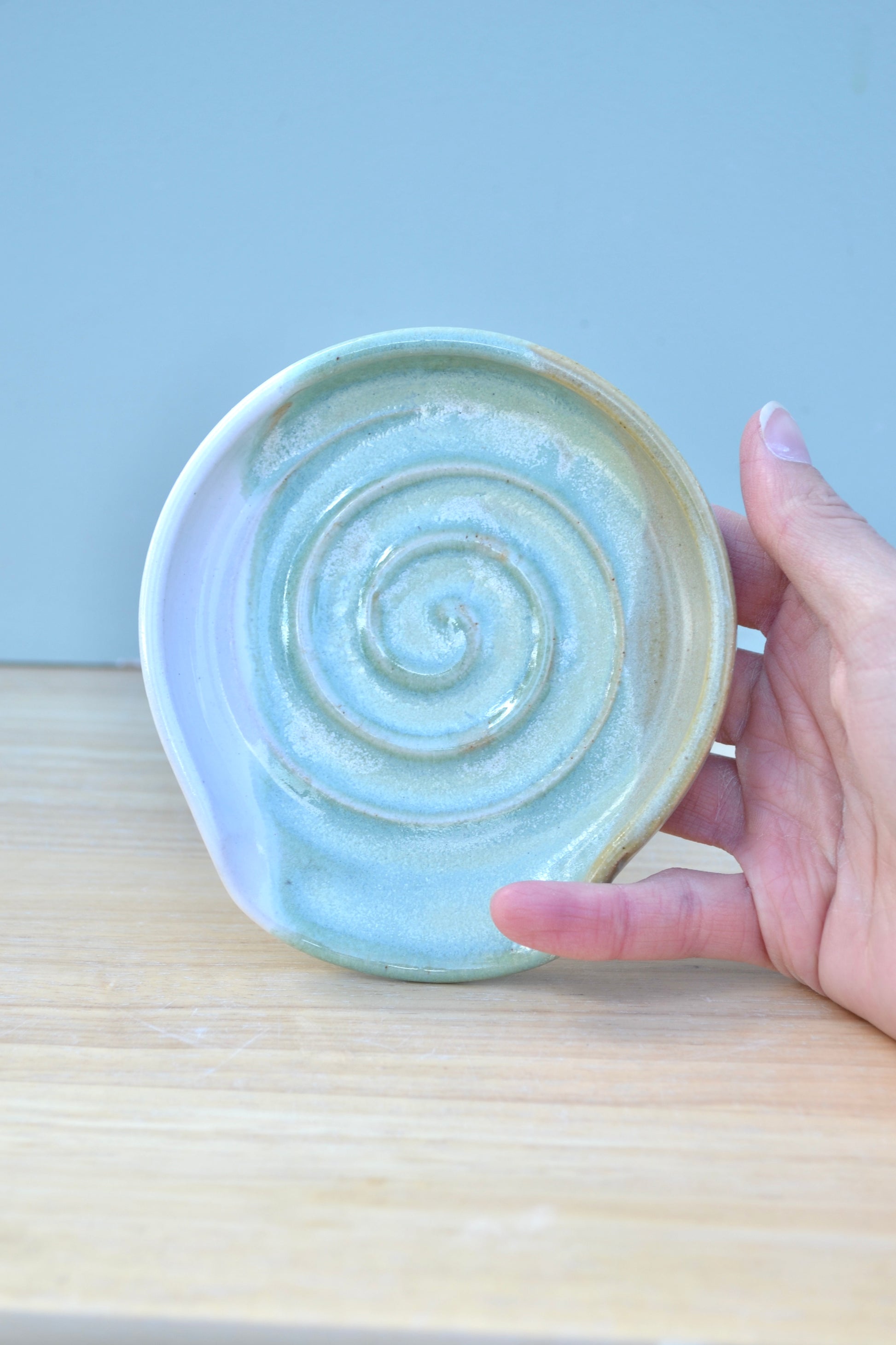 Hand-thrown white stoneware spoon rest with my own green and white glaze.