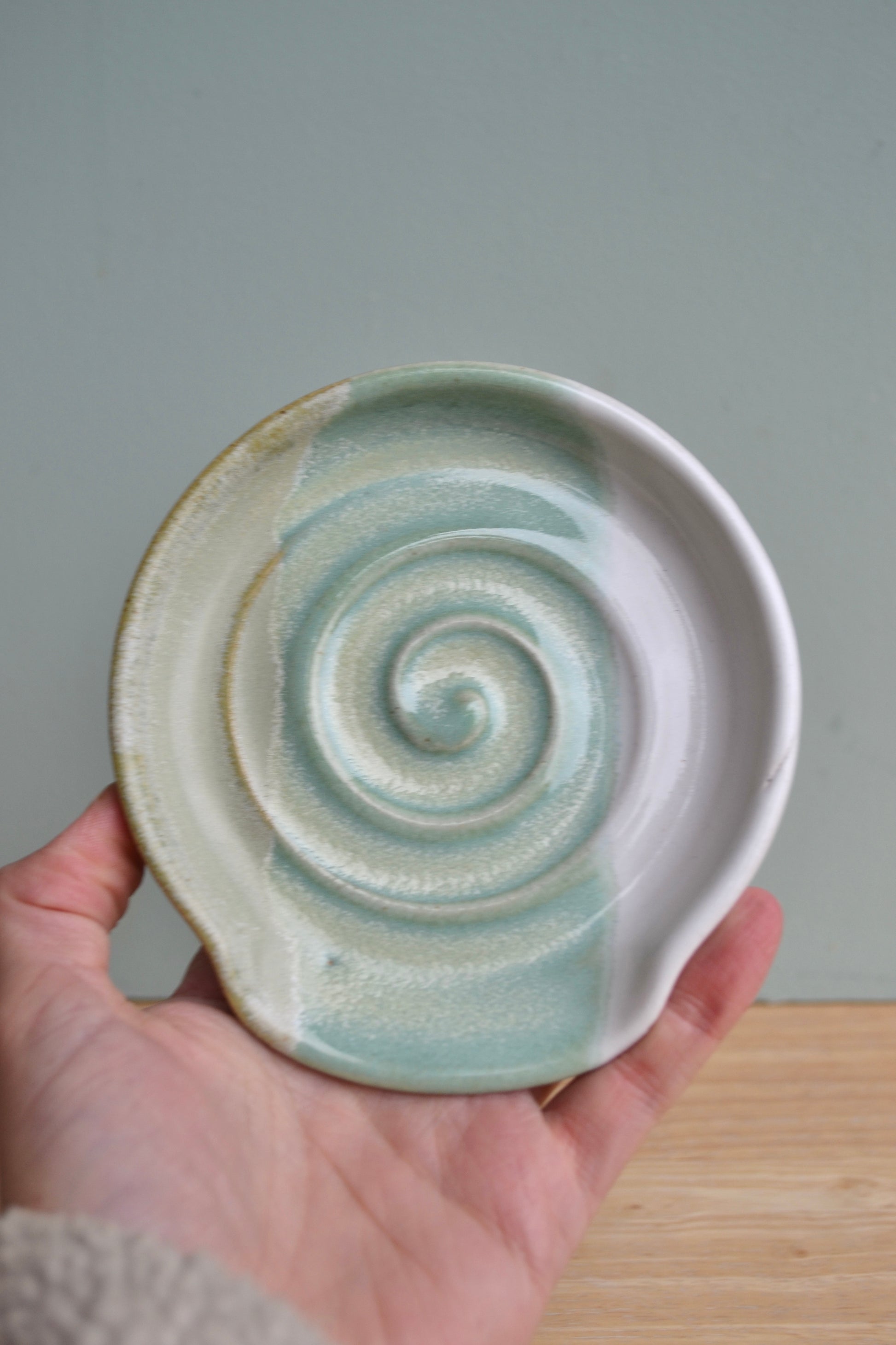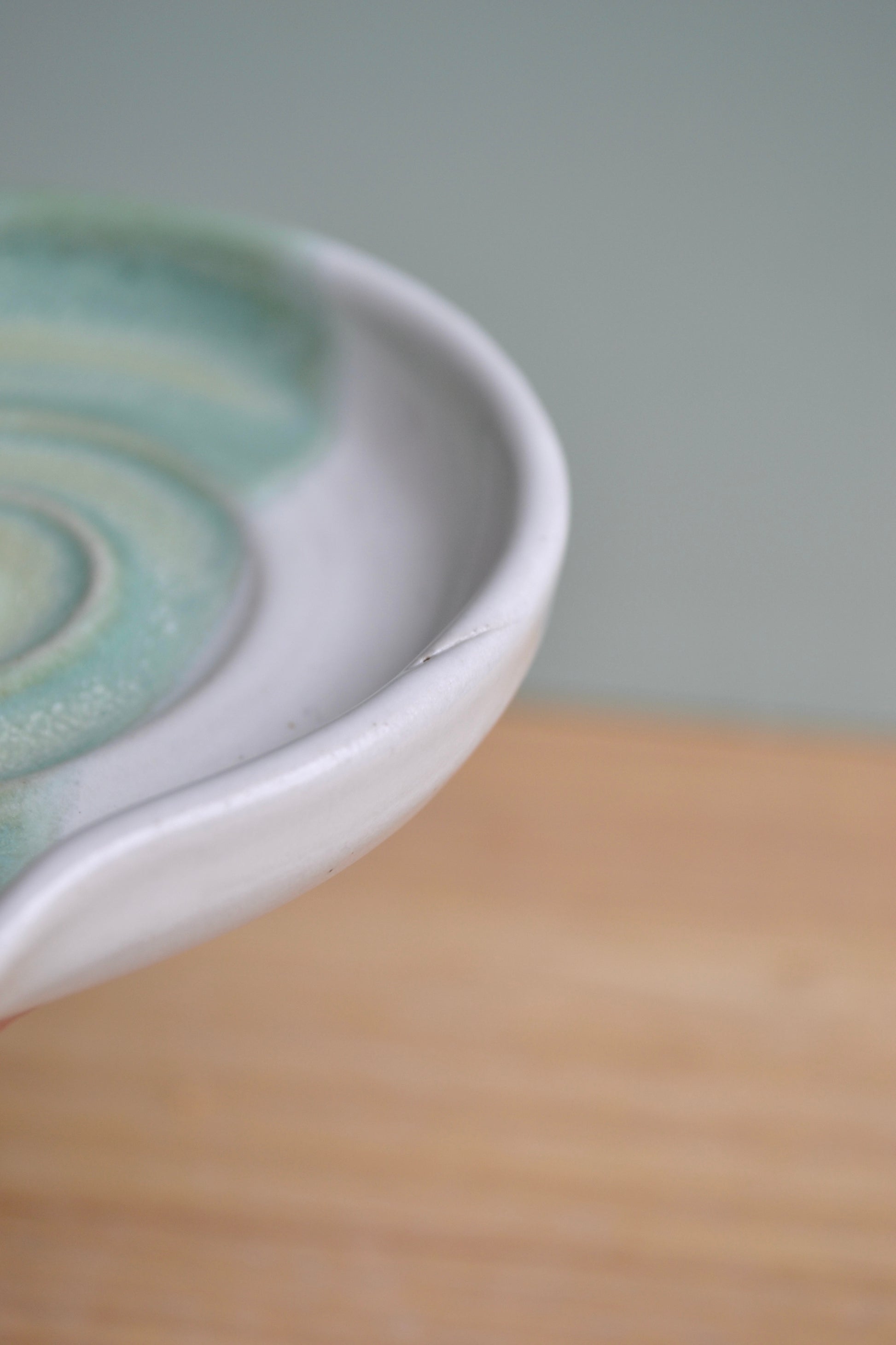Hand-thrown white stoneware spoon rest with my own green and white glaze.