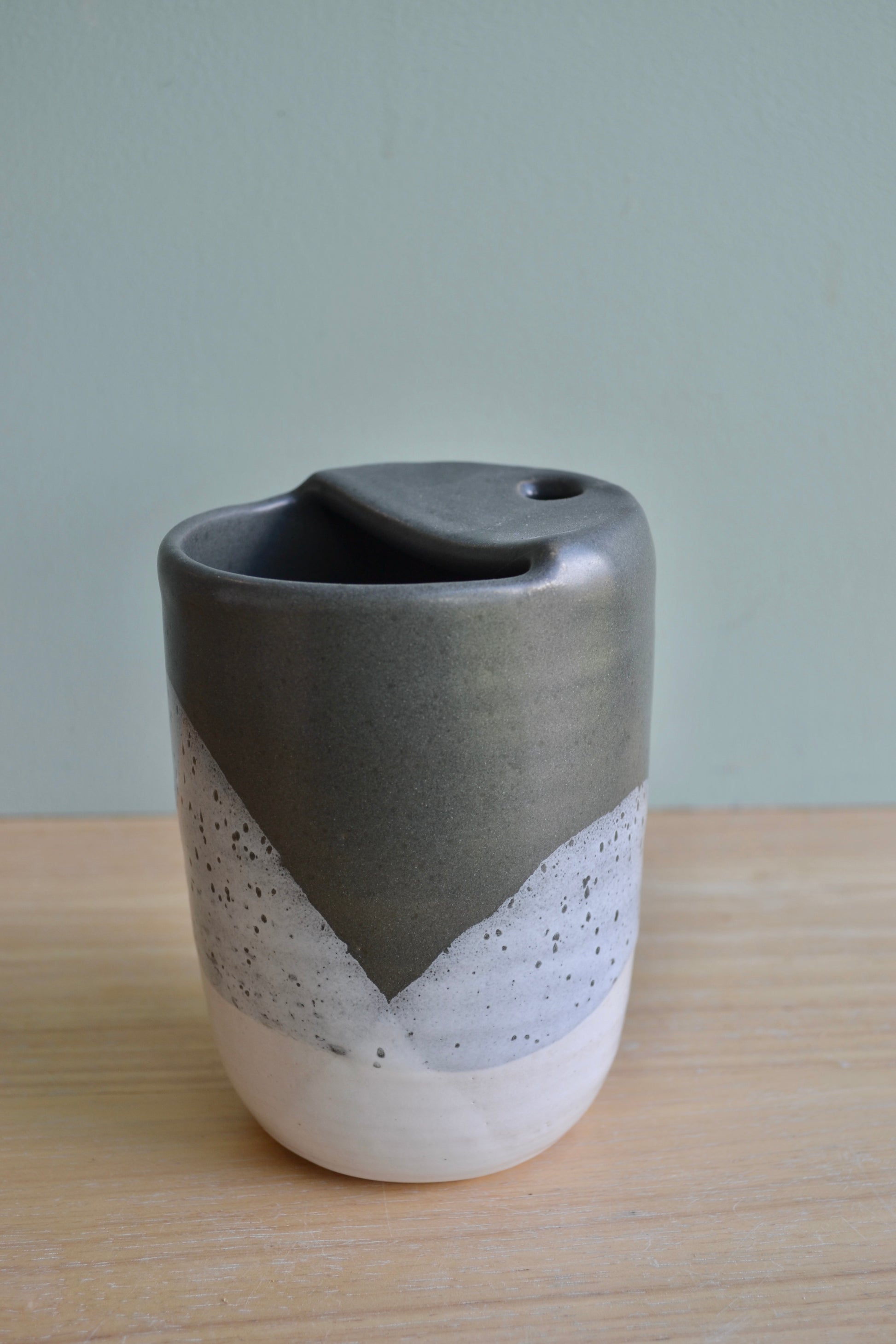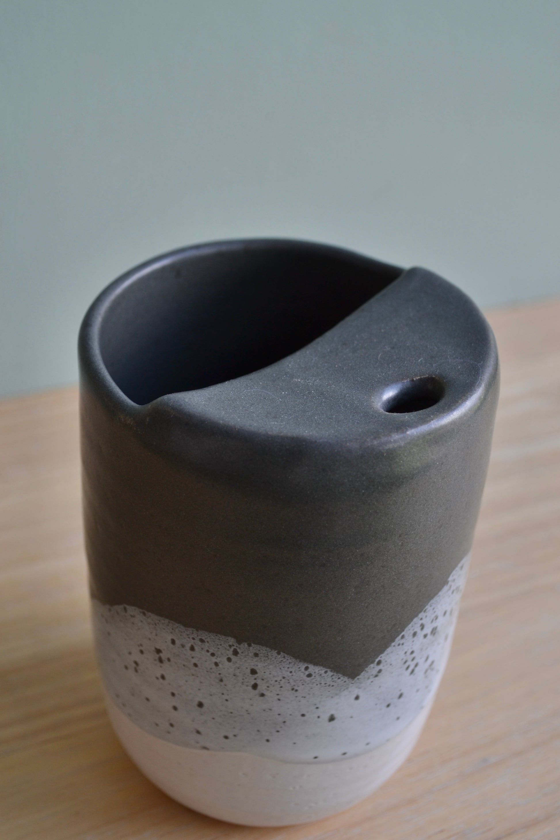 Hand-thrown white stoneware travel cup with my own unique grey and white glaze.